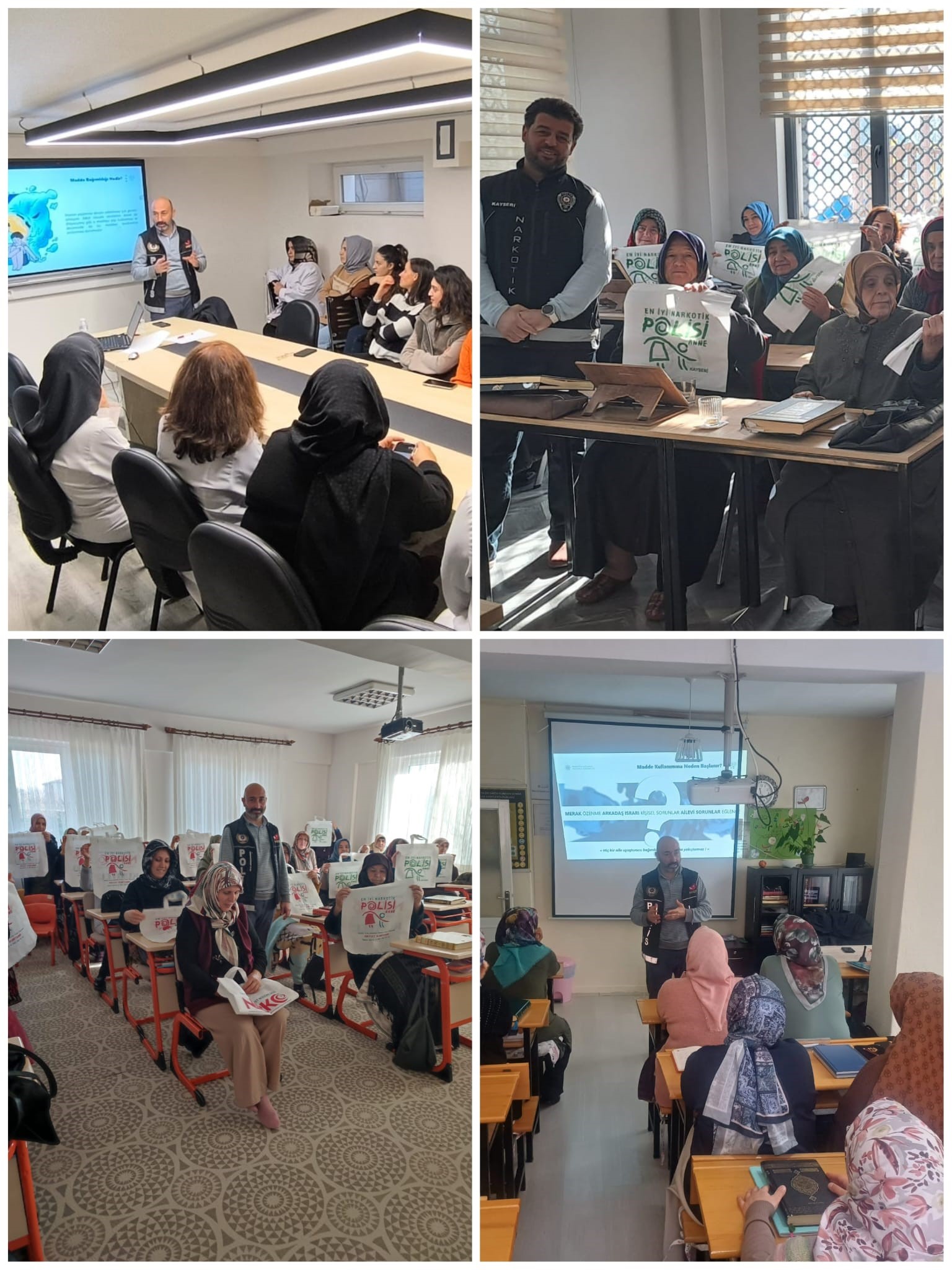 Kayseri İl Emniyet Müdürlüğü Narkotik Suçlarla Mücadele Şube Müdürlüğü ekipleri tarafından ‘En İyi Narkotik Polisi Anne’ projesi çerçevesinde bilgilendirme çalışması yapıldı. Ekipler tarafından Ayşe Halil Yıldız, Hatice Tanç ve Yeni Mahalle Kur'an Kursu kursiyerlerine ve Kayseri Gıda Kontrol Merkezi çalışanlarına yönelik toplam 133 anne ve anne adayı uyuşturucuyla mücadele konusunda bilgilendirildi.