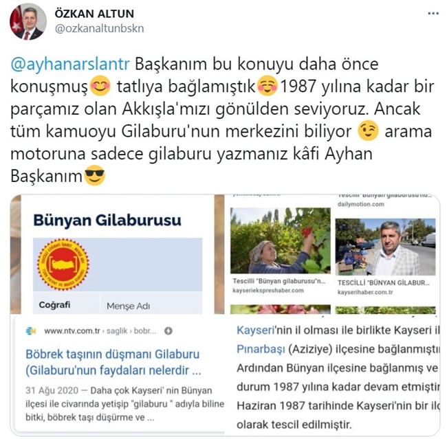 Twitter'dan Akkışla Belediye Başkanı Arslan'a yanıt veren Bünyan Belediye Başkanı Özkan Altun ise, "Ayhan Başkanım bu konuyu daha önce konuşmuş, tatlıya bağlamıştık. 1987 yılına kadar bir parçamız olan Akkışla'mızı gönülden seviyoruz. Ancak tüm kamuoyu Gilaburu'nun merkezini biliyor. Arama motoruna sadece gilaburu yazmanız kafi Ayhan Başkanım" ifadelerini kullandı. İŞTE O PAYLAŞIMLAR: