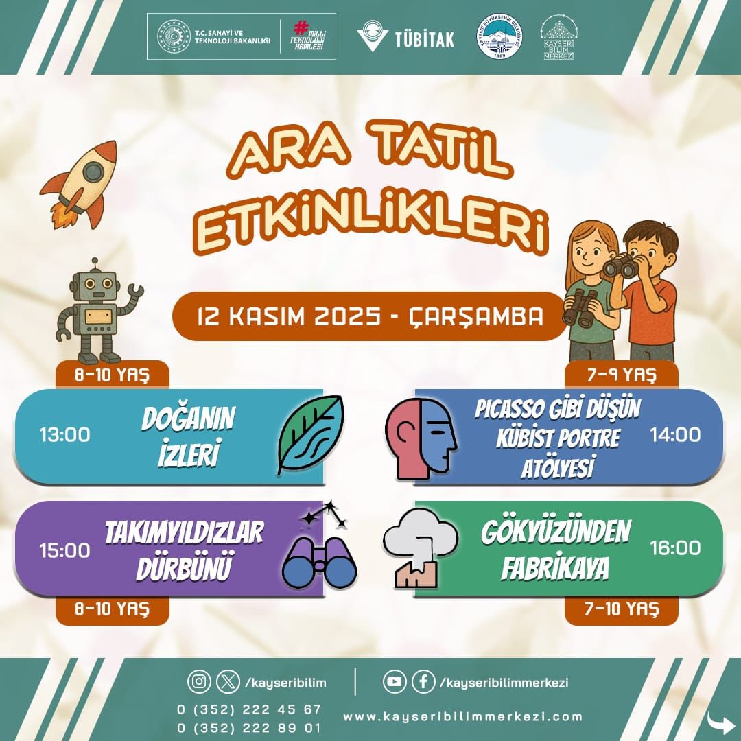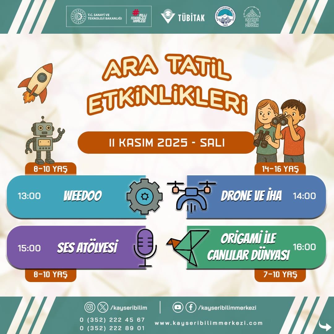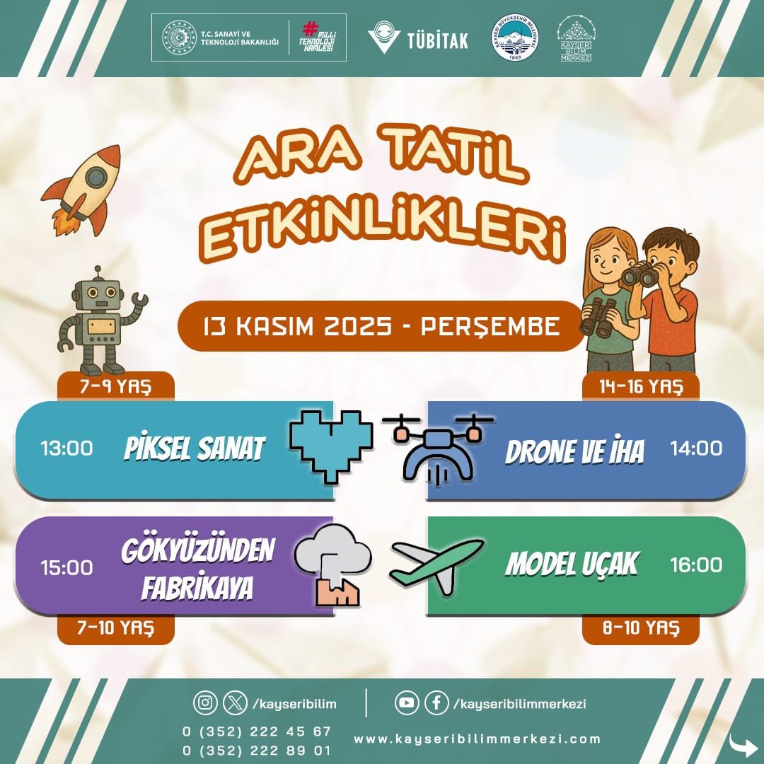 Öğrenmek, Keşfetmek ve Eğlenmek İsteyenler İçin Kaçırılmayacak FırsatBilimin eğlenceli ve keşif dolu dünyasını deneyimlemek isteyen öğrencileri Kayseri Bilim Merkezi’ne davet eden Büyükşehir, ara tatilde öğrenmek, keşfetmek ve eğlenmek isteyenler için kaçırılmayacak bir fırsat sunuyor.Detaylı bilgi ve kayıt için Kayseri Bilim Merkezi sosyal medya hesapları takip edilebilecek.