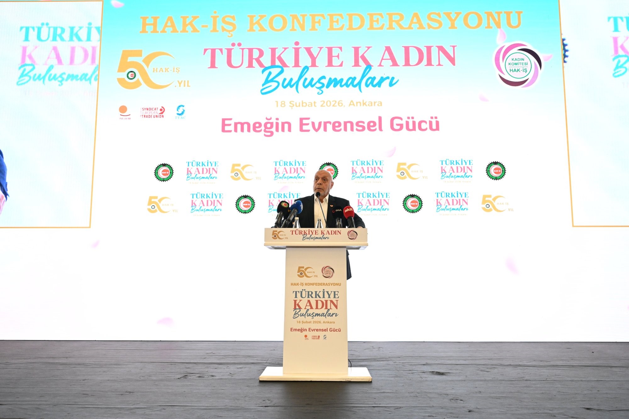 Programda konuşan HAK-İŞ Genel Başkanı Mahmut Arslan, "Kadın ve sorun maalesef hem ülkemizde hem de dünyada yan yana getiriliyor. Biz kadın ve sorun değil, kadın ve huzur yan yana gelsin istiyoruz. Olması gereken bu. Kadının olmadığı, kadın elinin değmediği, kadının içinde bulunmadığı hiçbir faaliyet maalesef ne bereketli olur ne de huzurlu olur. Onun için öncelikli olarak kadınların her alanda olduğu gibi çalışma hayatında yer almış, çalışmaya başlamış, bir sürü engelleri aşarak bir işletmede çalışmaya başlamış kadınların önünde yeni hedefler oluyor. Kadın sendikada oluyor. Sendikada görev almak istiyor, mücadele ediyor. Bunların her birisinin ne kadar zor olduğunu biliyorum. Ama bu süreçleri bizim tamamlamamız gerekiyor. Yetmiyor, bizim kadını, kadın cevherini maalesef istismar eden yapılara karşı da kendimizi ve toplumu korumamız gerekiyor. Bunun için de çaba, gayret içindeyiz" dedi.
