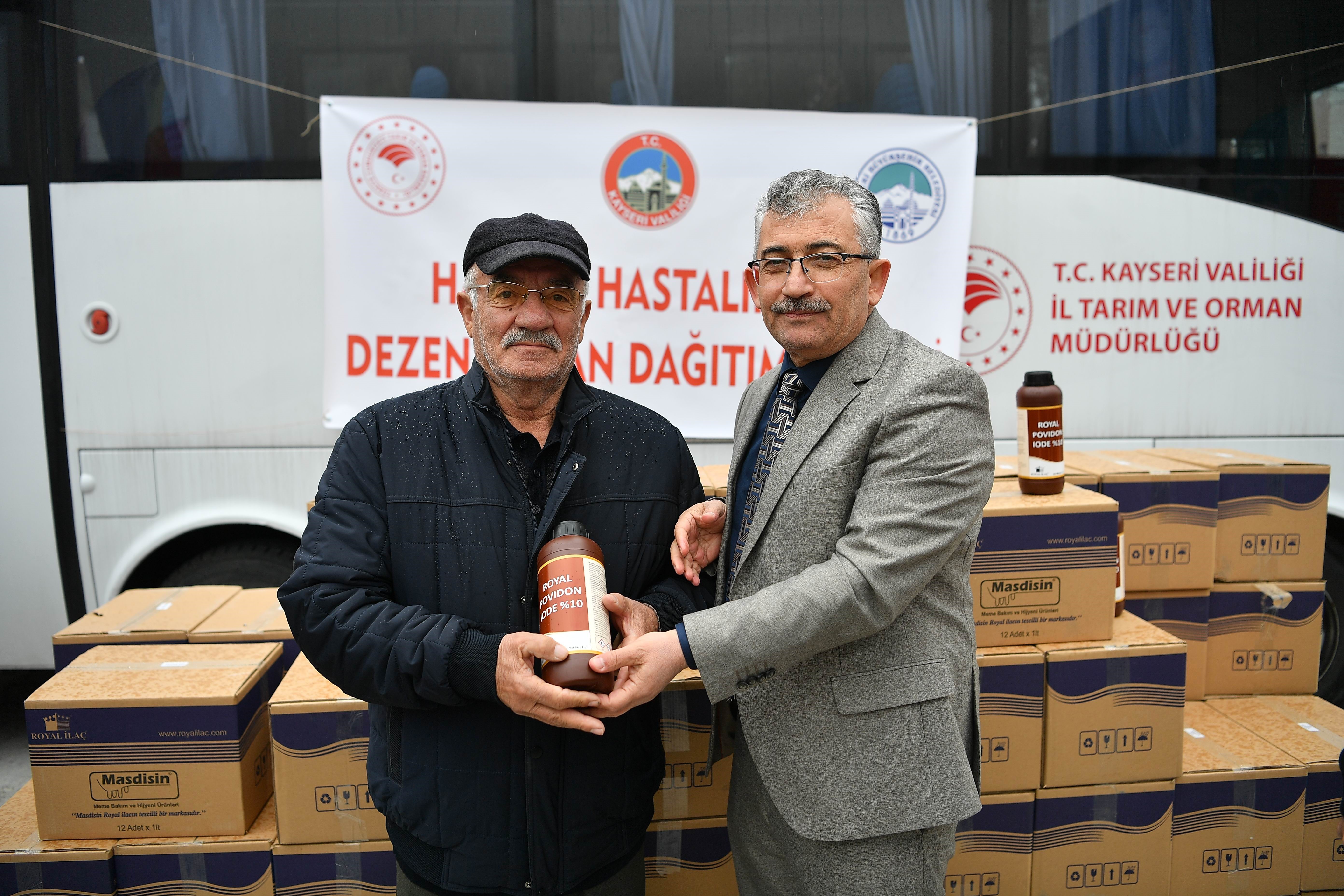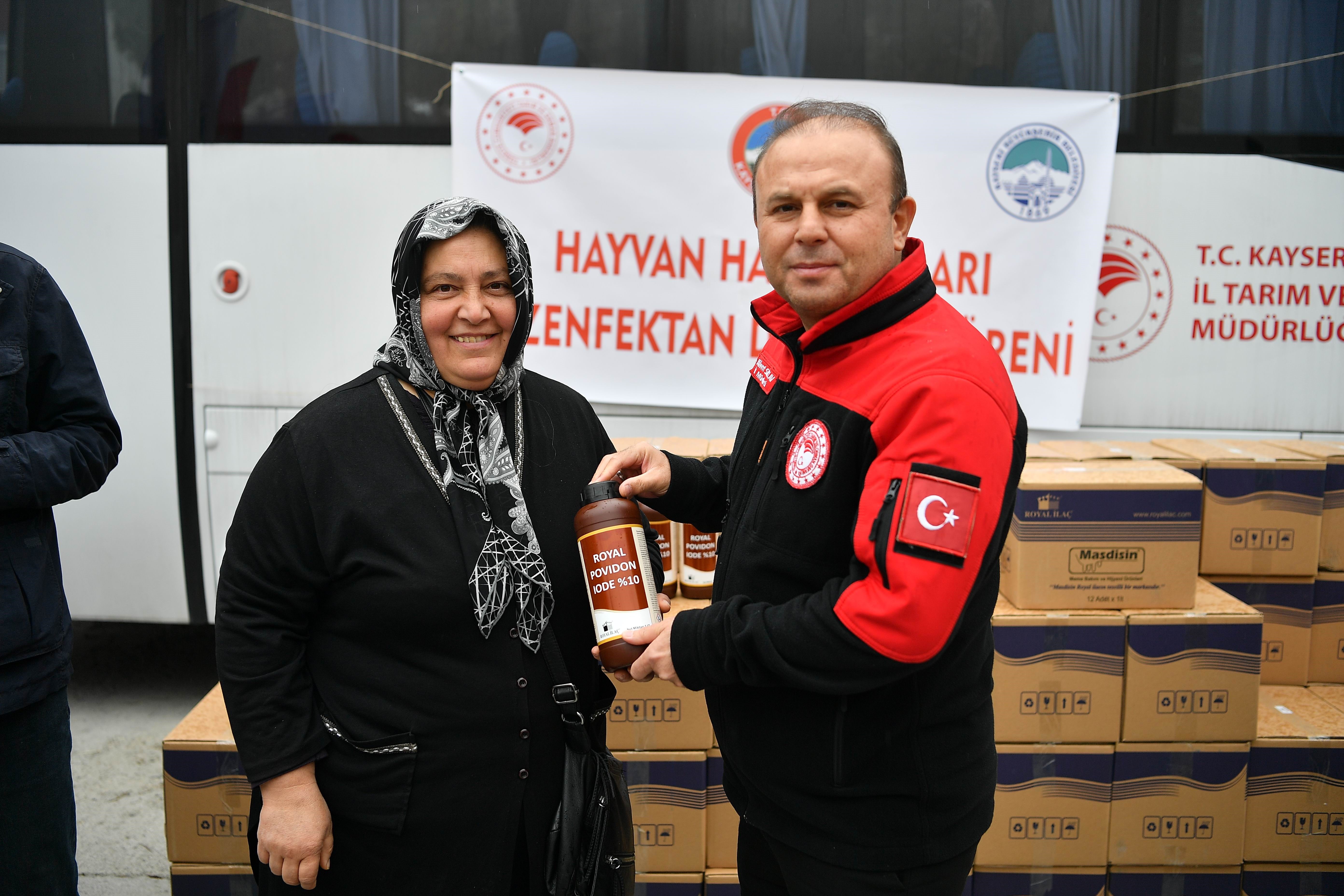 Kayseri Büyükşehir Belediyesi’nin katkıları ile Kayseri Valiliği ve İl Tarım ve Orman Müdürlüğü iş birliğinde, hayvancılık yapan besicilere hayvan hastalıkları ile mücadele kapsamında dezenfektan madde dağıtımında bulunuldu.