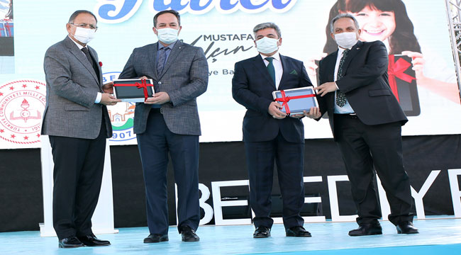 Konuşmaların ardından tabletler, ihtiyaç sahibi öğrencilere ulaştırılmak üzere okul müdürlerine teslim edildi.