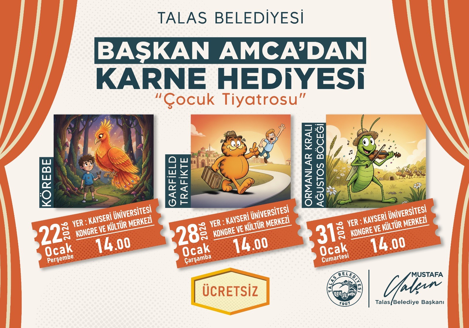 Talas Belediyesi; yarıyıl tatiline giren çocuklar için kültür ve sanat dolu bir karne hediyesi hazırladı. 'Başkan Amca’dan Karne Hediyesi-Çocuk Tiyatrosu' etkinliği kapsamında sevilen çocuk oyunları minik izleyicilerle ücretsiz olarak buluşacak.