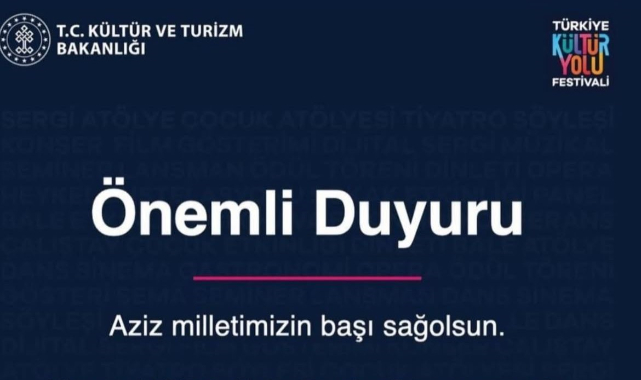 Yapılan açıklamada; "Aziz milletimizin başı sağ olsun. Kayseri Kültür Yolu Festivali kapsamında bugün yapılacak tüm konser etkinliklerimiz iptal edilmiştir. Şehitlerimize Allah'tan rahmet, yüce milletimize bağ sağlığı dileriz" denildi.
