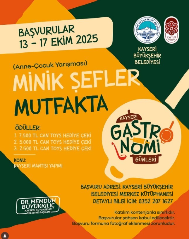 Kayseri Gastronomi Günleri kapsamında, Kayseri mantısı yapımı konulu, Minik Şefler Mutfakta sloganıyla anne-çocuk yarışmasına başvurular 13-17 Ekim arasında Kayseri Büyükşehir Belediyesi Merkez Kütüphanesi'ne yapılacak. Katılımın kontenjanla sınırlı olduğu yarışma hakkında 0352 207 16 27 telefon numarasından detaylı bilgi alınabilecek. Başvurular şahsen yapılacak. Birinciye 7 bin 500 TL hediye çeki, ikinciye 5 bin TL hediye çeki ve üçüncüye 2 bin 500 TL hediye çeki verilecek.
