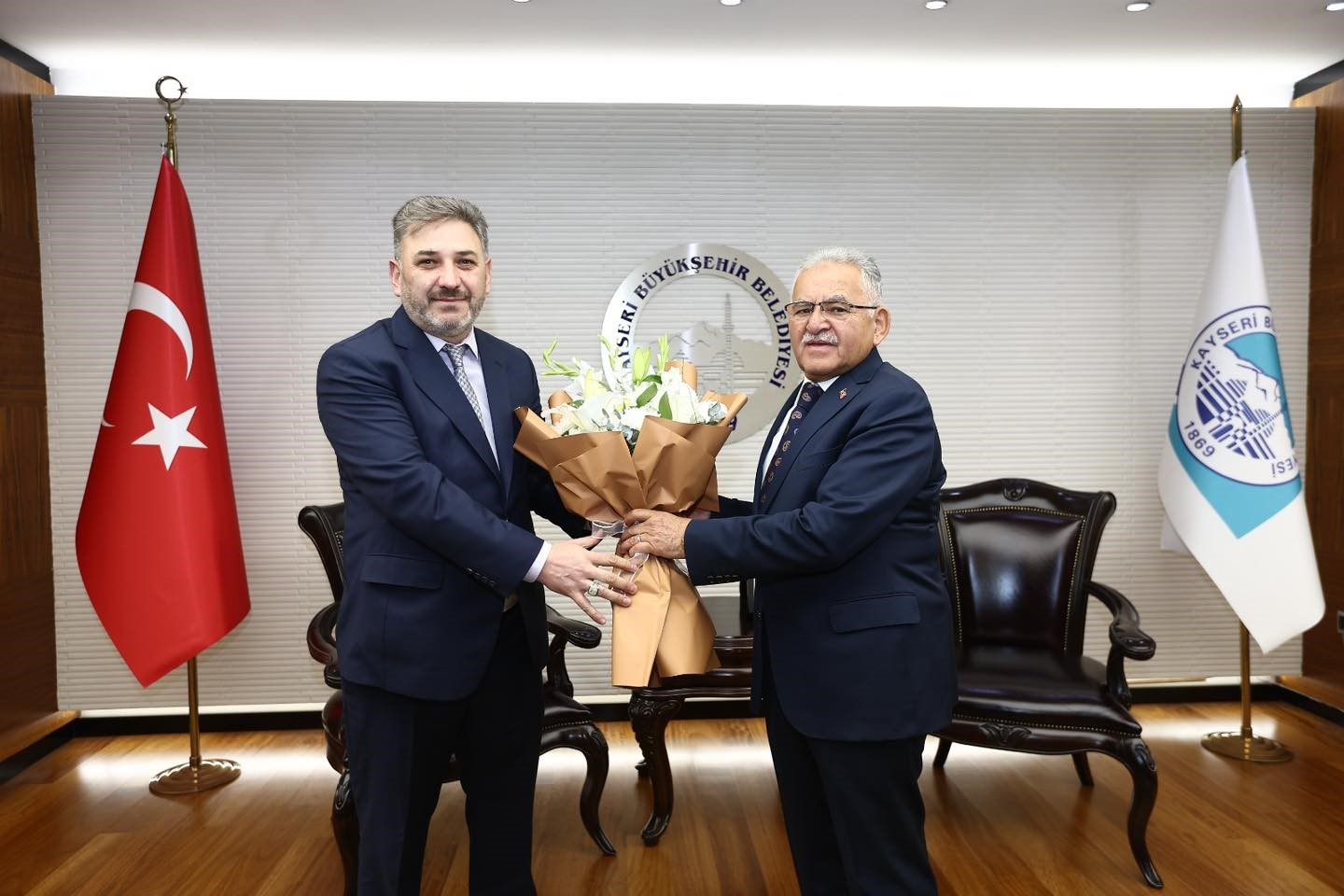 Kayseri Büyükşehir Belediye Başkanı Dr. Memduh Büyükkılıç, Hal İşletmeleri Başkanlığı’na yeni seçilen Sinan Taşpınar ve yönetim kurulu üyelerini makamında ağırladı. Başkan Büyükkılıç, esnafların her zaman yanında yer aldıklarını söylerken, Taşpınar da esnaf dostu bir belediye başkanı olan Başkan Büyükkılıç’a teşekkür ederek, şükranlarını sundu.