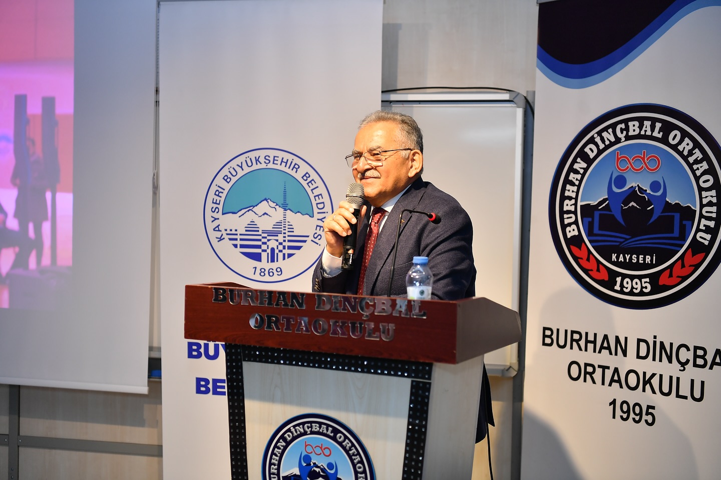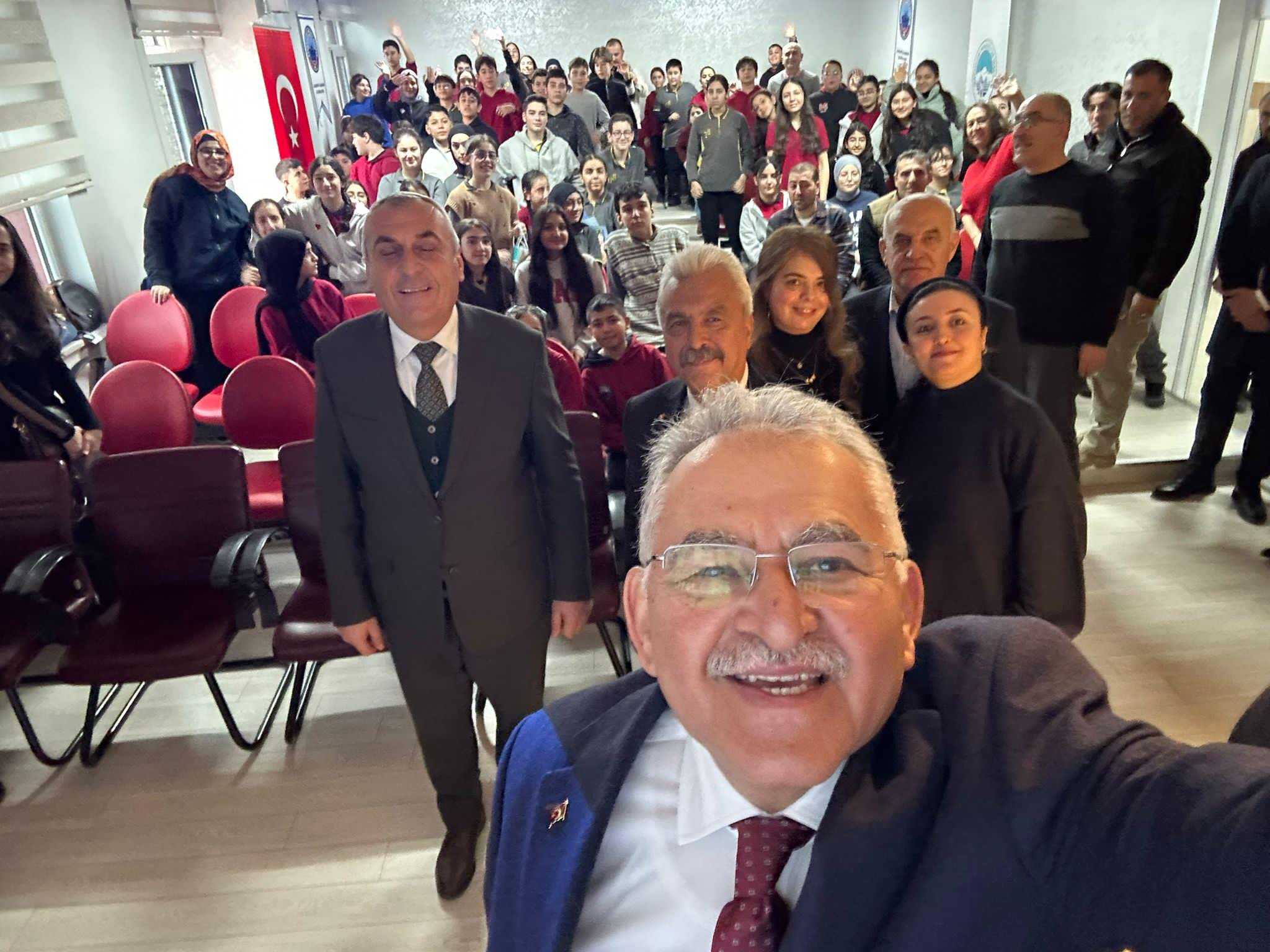 Burhan Dinçbal Ortaokulu Müdürü Ahmet Demirbaş ise “Çok önemli bir konuğu sizlerle buluşturmak istedik ve kendileri davetimizi kırmadılar. Kendilerine zahmet edip geldikleri için çok teşekkür ediyorum. Başkanımızı anlatmaya gerek yok ama 2000 yılından beri kadrolu olarak Kayseri’de okul müdürlüğü yapıyorum. Çok kıymetli başkanımızla sürekli bir iletişimimiz oldu. Birçok okulda görev yaptım, bütün okullarımızda çok kıymetli başkanımızın her zaman eli üzerimizde oldu. Ne zaman ki bir ihtiyacımız oldu, ne zaman ki işimiz düştü okumuzla alakalı çok fazlasıyla bize yardımcı oldu. Bu yüzden kendilerine her zaman yanımızda olduğu için çok teşekkür ediyorum” ifadelerinde bulundu.