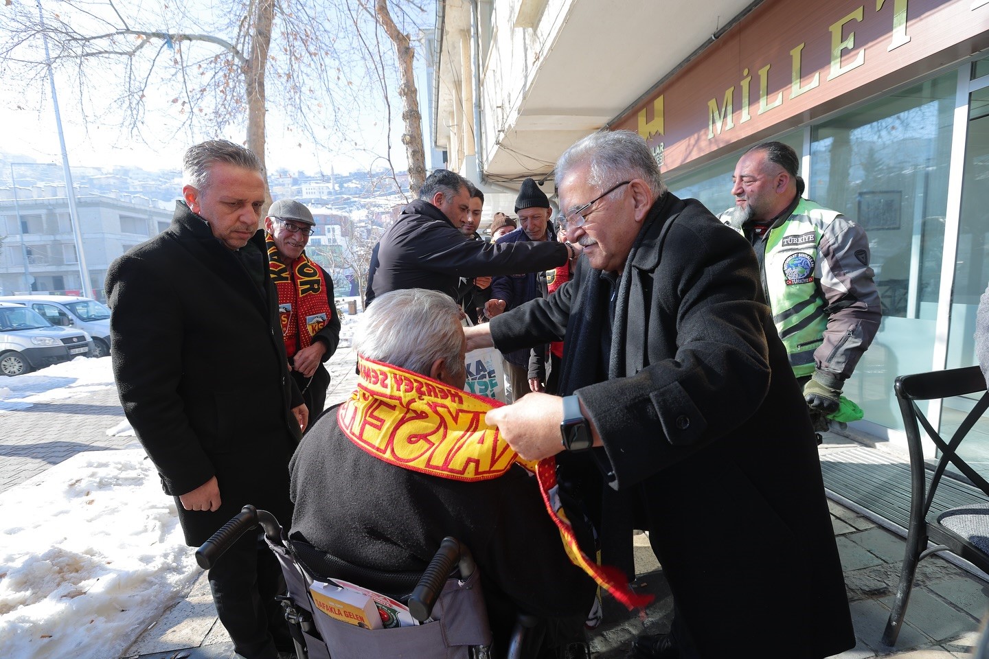 Kayseri Büyükşehir Belediye Başkanı Dr. Memduh Büyükkılıç, Hacılar ilçesinde vatandaşlarla bir araya gelerek gençlere Kayserispor atkısı hediye etti, büyüklerle sohbet etti.