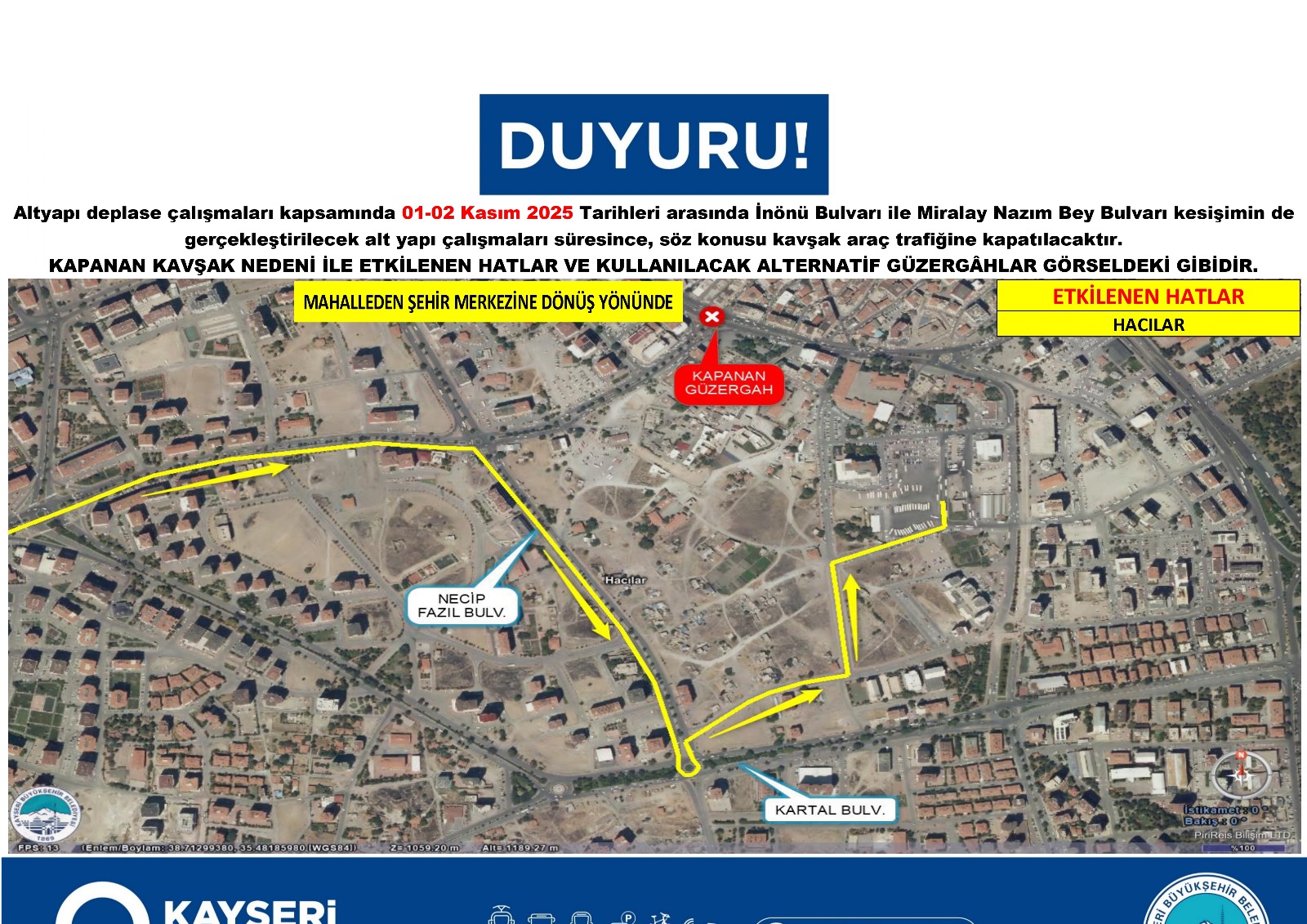 Kayseri Büyükşehir Belediyesi, altyapı deplase çalışmaları kapsamında 1-2 Kasım 2025 tarihlerinde İnönü Bulvarı ile Miralay Nazım Bey Bulvarı kesişimindeki kavşağı araç trafiğine kapatacak. Sürücüler, belirlenen alternatif güzergâhları kullanmaya davet edildi.