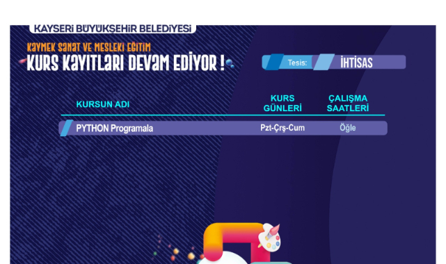 KAYMEK, teknoloji dünyasında güçlü bir adım atmak isteyen gençler için PYTHON Programlama Kursu imkânı sunuyor. Ücretsiz eğitim fırsatıyla, sınırlı kontenjanla sunulan kursa katılmak için kayıtlar devam ediyor.