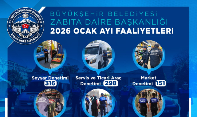Kayseri Büyükşehir Belediyesi Zabıta Daire Başkanlığı, şehir genelinde huzur, güvenlik ve düzenin sağlanmasına yönelik denetimlerinde 2026 yılının ilk ayında bin 462 denetim yaparak 161 yasal işlem uyguladı.