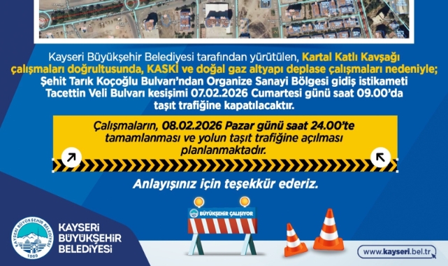 Kayseri Büyükşehir Belediyesi tarafından yapılan uyarıda, "Kayseri Büyükşehir Belediyesi tarafından yürütülen Kartal Kavşağı çalışmaları doğrultusunda; deplase çalışmaları nedeniyle Şehit Tarık Koçoğlu Bulvarı’ndan Organize Sanayi Bölgesi gidiş istikameti Tacettin Veli Bulvarı kesişimi 07.02.2026 Cumartesi günü saat 09.00’da taşıt trafiğine kapatılacaktır. Çalışmaların, 08.02.2026 Pazar günü saat 24.00’te tamamlanması ve yolun taşıt trafiğine açılması planlanmaktadır" ifadelerine yer verildi.