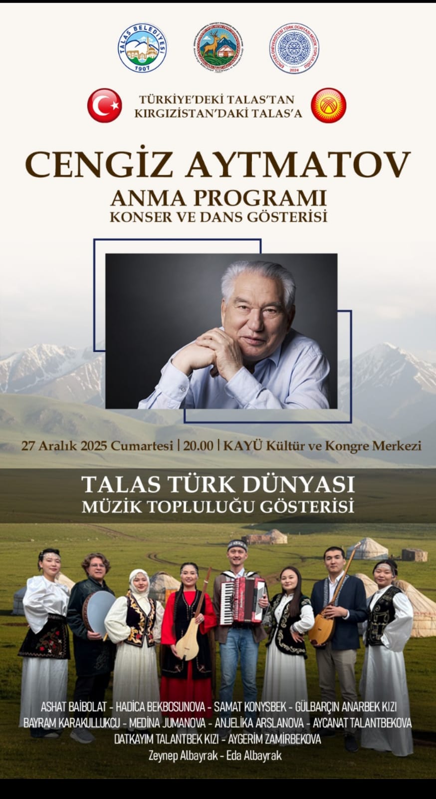 Talas Belediyesi, Erciyes Üniversitesi Türk Dünyası Müzik Topluluğu ve Kayseri’de yaşayan Kırgız Türkleri tarafından kurulan Akmaral Kırgız Kültür, Sosyal Yardımlaşma ve Dayanışma Derneği iş birliğiyle hazırlanan program, sadece bir anma gecesi olmanın ötesine geçerek Türk dünyası arasında kurulan kültürel bağları sahneye taşıyacak.