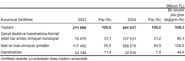 Çevre koruma harcamaları 2024 yılında bir önceki yıla göre yüzde 108,3 artarak toplam 441 milyar TL olarak gerçekleşti.Türkiye İstatistik Kurumu (TÜİK), 2024 yılına ilişkin Çevre Koruma Harcama İstatistikleri’ni paylaştı. Buna göre, çevre koruma harcamaları 2024 yılında bir önceki yıla göre yüzde 108,3 artarak toplam 441 milyar TL olarak gerçekleşti. Çevre koruma harcamalarının yüzde 60,9’u mali ve mali olmayan şirketler, yüzde 31,2’si genel devlet ve hanehalkına hizmet eden kar amacı olmayan kuruluşlar ve yüzde 7,9’u ise hanehalkları tarafından yapıldı.Kurumsal sektörlere göre çevre koruma harcamaları, 2023 - 2024