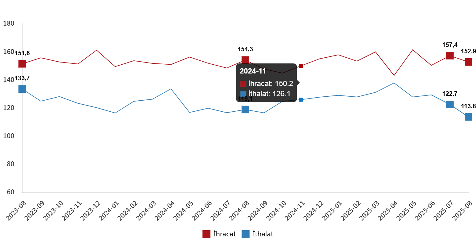 STIC : Uluslararası Standart Ticaret SınıflamasıMevsim ve takvim etkilerinden arındırılmış ihracat miktar endeksi yüzde 2,8 azaldı Mevsim ve takvim etkilerinden arındırılmış seriye göre ihracat miktar endeksi; 2025 Temmuz ayında 157,4 iken 2025 Ağustos ayında yüzde 2,8 oranında azalarak 152,9 oldu. Takvim etkilerinden arındırılmış seriye göre ise ihracat miktar endeksi; 2024 yılı Ağustos ayında 147,5 iken 2025 yılı Ağustos ayında yüzde 0,9 oranında azalarak 146,1 oldu. Mevsim ve takvim etkilerinden arındırılmış ithalat miktar endeksi yüzde 7,2 azaldı Mevsim ve takvim etkilerinden arındırılmış seriye göre ithalat miktar endeksi; 2025 Temmuz ayında 122,7 iken 2025 Ağustos ayında yüzde 7,2 oranında azalarak 113,8 oldu. Takvim etkilerinden arındırılmış seriye göre ise ithalat miktar endeksi; 2024 yılı Ağustos ayında 114,7 iken 2025 yılı Ağustos ayında yüzde 4,5 oranında azalarak 109,6 oldu.Mevsim ve takvim etkilerinden arındırılmış dış ticaret miktar endeksleri, Ağustos 2025