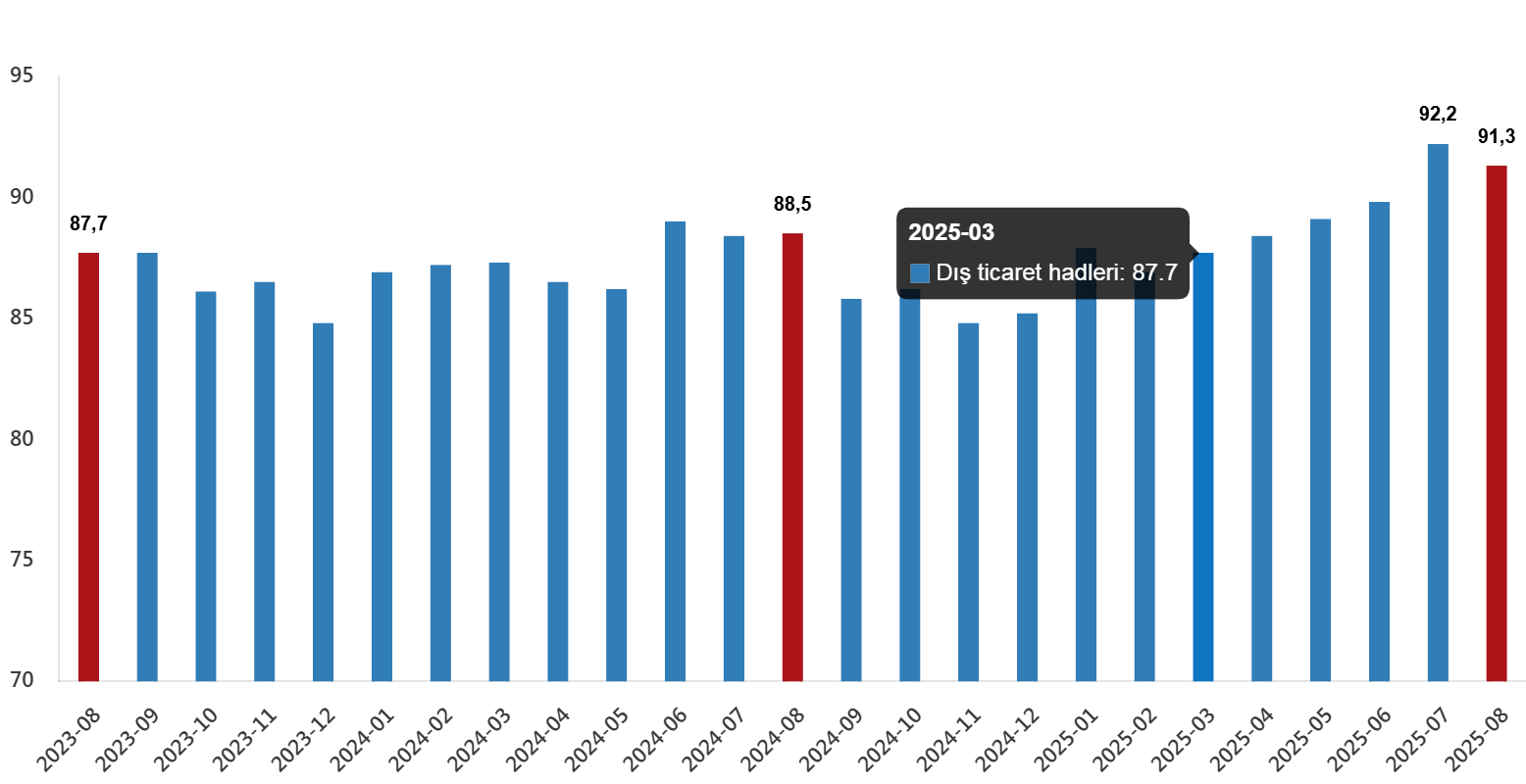 Dış ticaret haddi 2025 yılı Ağustos ayında 91,3 olarak gerçekleştiİhracat birim değer endeksinin ithalat birim değer endeksine bölünmesiyle hesaplanan ve 2024 yılı Ağustos ayında 88,5 olarak elde edilmiş olan dış ticaret haddi, 2,8 puan artarak, 2025 yılı Ağustos ayında 91,3 oldu.Dış ticaret hadleri, Ağustos 2025