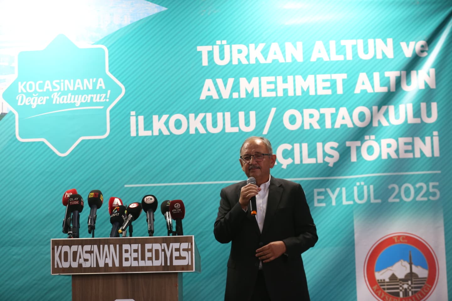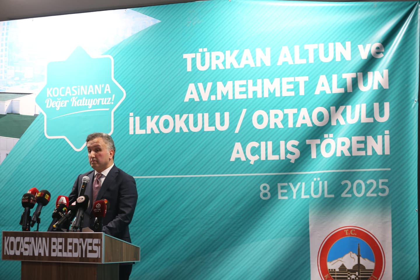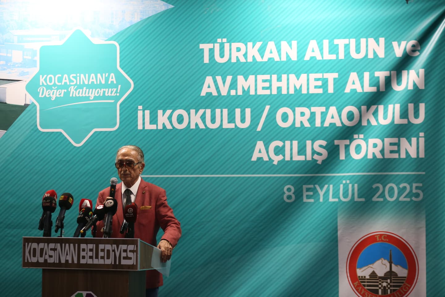Kocasinan Belediyesi’nin hayırsever iş birliğiyle Kayseri’ye kazandırdığı ‘Türkan Altun ve Av. Mehmet Altun İlkokulu/Ortaokulu’, 2025-2026 eğitim-öğretim döneminde hizmete açılarak resmi açılışı gerçekleştirildi. Okul açılışında konuşan Kocasinan Belediye Başkanı Ahmet Çolakbayrakdar, “Eğitime yapılan yatırım, geleceğe yapılan en büyük yatırımdır.” dedi. Başkan Çolakbayrakdar’ın ev sahipliğinde Yakut Mahallesi’nde düzenlenen ‘Türkan Altun ve Av. Mehmet Altun İlkokulu/Ortaokulu’nun açılış törenine; Kayseri Valisi Gökmen Çiçek, önceki dönem Çevre, Şehircilik ve İklim Değişikliği Bakanı Mehmet Özhaseki, AK Parti Kayseri Milletvekilleri Dr. Murat Cahid Cıngı ve Sayın Bayar Özsoy, Büyükşehir Belediye Başkanı Memduh Büyükkılıç, AK Parti İl Başkanı Hüseyin Okandan, Kocasinan Kaymakamı Erdoğan Turan Ermiş, Kayseri İl Millî Eğitim Müdürü Coşkun Esen, Kocasinan İlçe Millî Eğitim Müdürü Sıddık Kaya, hayırsever Mehmet Altun ailesi, hayırsever Osman Ulubaş, sivil toplum kuruluşları, il müdürleri, oda başkanları, meclis üyeleri, kamu kurum ve kuruluşların temsilcileri, muhtarlar ve Kayserililer katıldı.