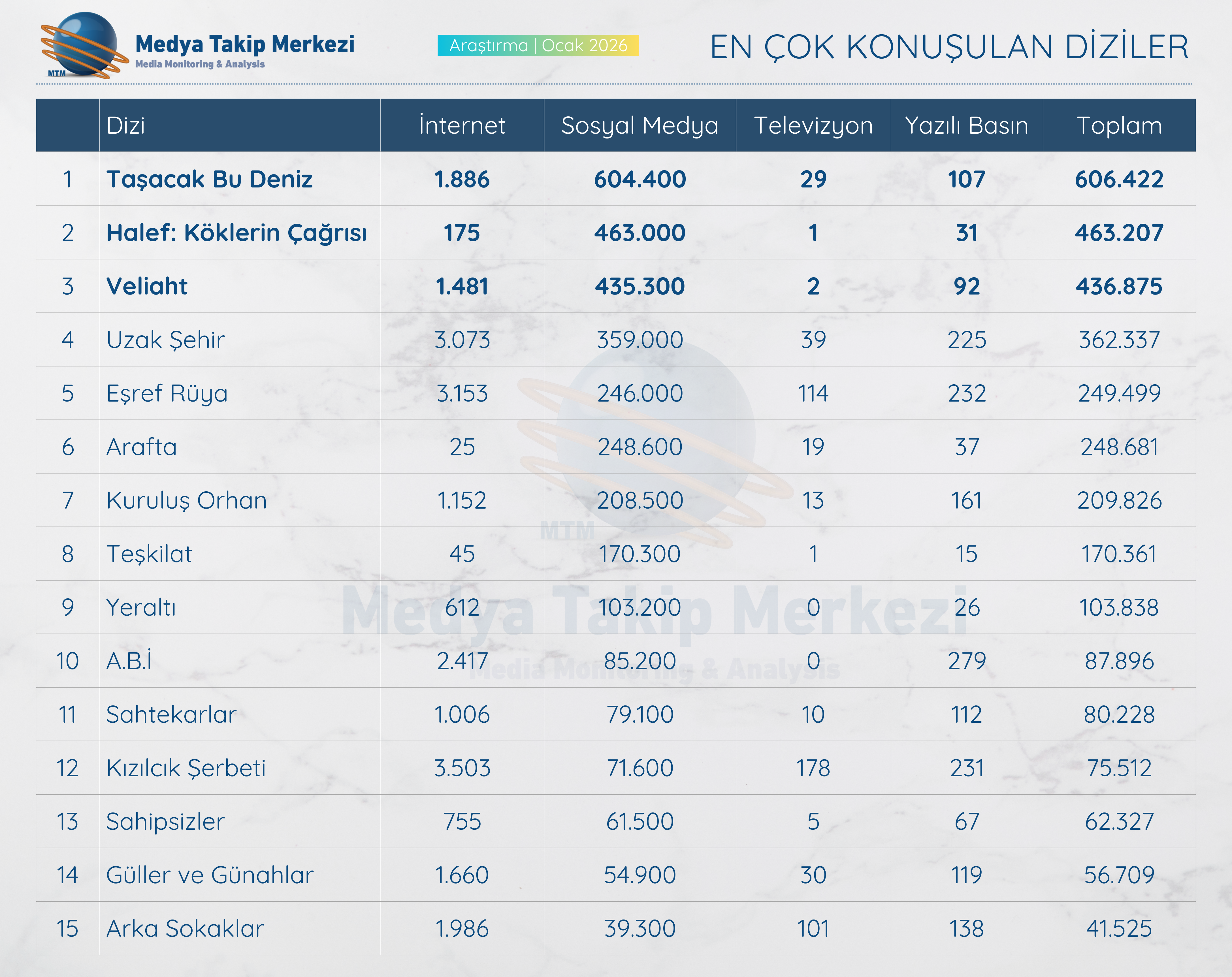01–31 Ocak 2026 tarihleri arasında; televizyon kanalları, yazılı basın, internet haber siteleri ve sosyal medya platformlarını kapsayan 10 bini aşkın kaynak üzerinden hazırlanan MTM Medya Takip Merkezi “En Çok Konuşulan Diziler Raporu”, dizilerin ay boyunca hem haber üretimi hem de dijital etkileşim performanslarına ışık tutuyor.