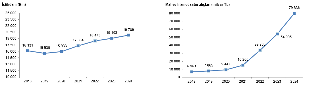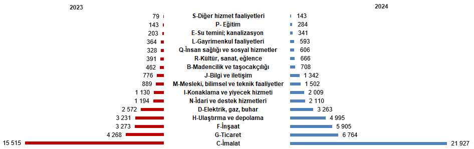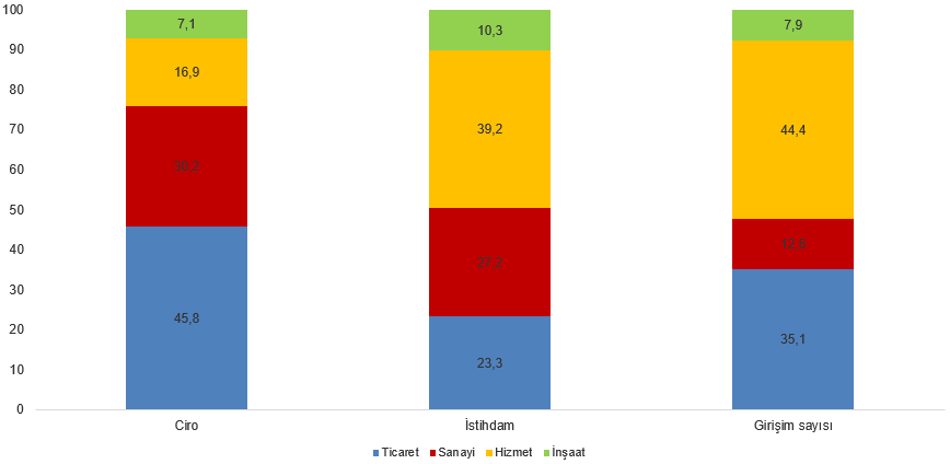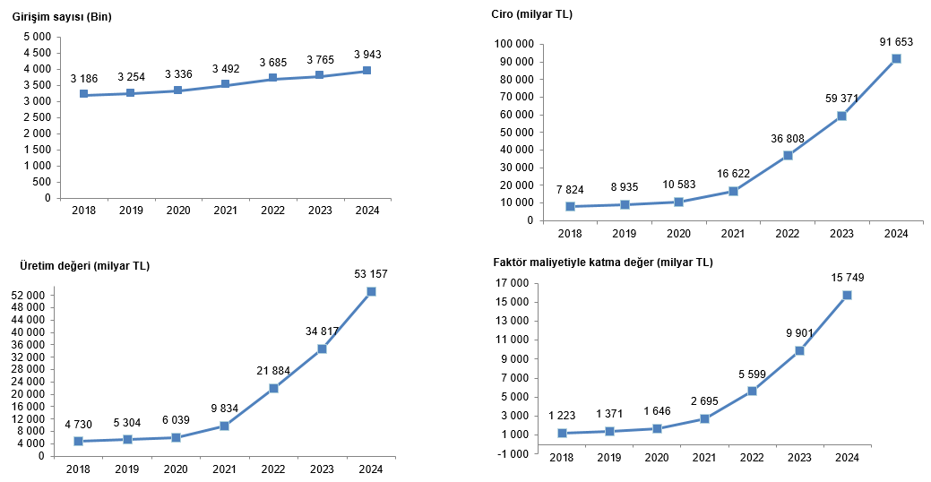 Aktif girişim sayısı 2024 yılında 3 milyon 942 bin 781 olarak gerçekleşti Geçici sonuçlara göre 2024 yılında ciro 91 trilyon 653 milyar TL, üretim değeri 53 trilyon 157 milyar TL, faktör maliyetiyle katma değer 15 trilyon 749 milyar TL olarak gerçekleşirken mal ve hizmetlerin toplam satın alışları 79 trilyon 836 milyar TL olarak gerçekleşmiştir. İstihdamda ise 19 milyon 789 bin 7 kişi olarak gerçekleşti.Yıllık sanayi ve hizmet istatistiklerine ilişkin temel göstergeler, 2018-2024