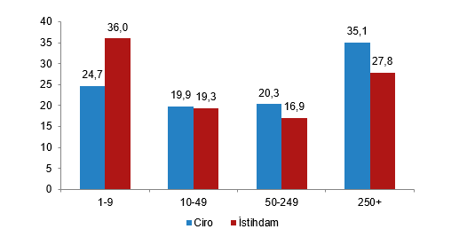 Ciroda en yüksek payı 250+ büyüklük grubu aldı Ciro payının 2024 yılında yüzde 35,1’ini 250+ büyüklük grubu, yüzde 24,7’sini 1-9 büyüklük grubu, yüzde 19,9’unu 10-49 büyüklük grubu ve yüzde 20,3’ünü ise 50-249 büyüklük grubu oluşturdu. İstihdamda ise yüzde 36,0’ını 1-9 büyüklük grubu, yüzde 27,8’ini 250+ büyüklük grubu, yüzde 19,3’ünü 10-49 büyüklük grubu ve yüzde 16,9’unu ise 50-249 büyüklük grubu oluşturdu.Büyüklük grubuna göre ciro ve istihdam dağılımı, (%),2024