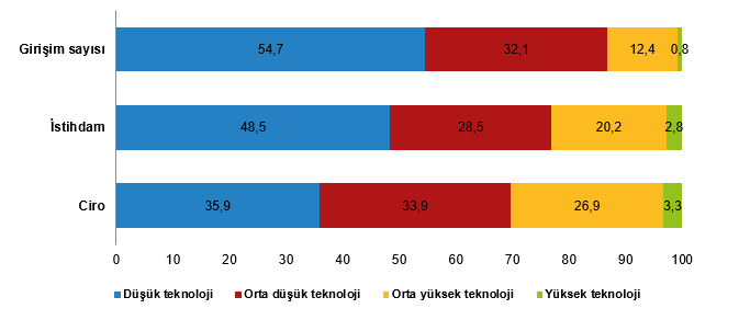 İmalat sanayindeki girişimlerin yüzde 54,7’si düşük teknoloji faaliyetlerinde yer aldıDüşük teknoloji faaliyetlerinde yer alan bu girişimler, istihdamın yüzde 48,5’ini, cironun ise yüzde 35,9’unu oluşturdu.İmalat sanayinde temel göstergelerin teknoloji düzeyine göre oransal dağılımı, (%), 2024