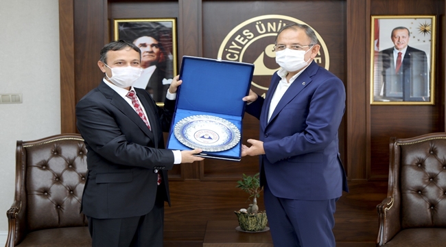 Toplantı sonrası Rektör Prof. Dr. Mustafa Çalış tarafından AK Parti Genel Başkan Yardımcısı ve Yerel Yönetimler Başkanı Mehmet Özhaseki’ye üniversitenin çini işlemeli tabağı takdim edildi.