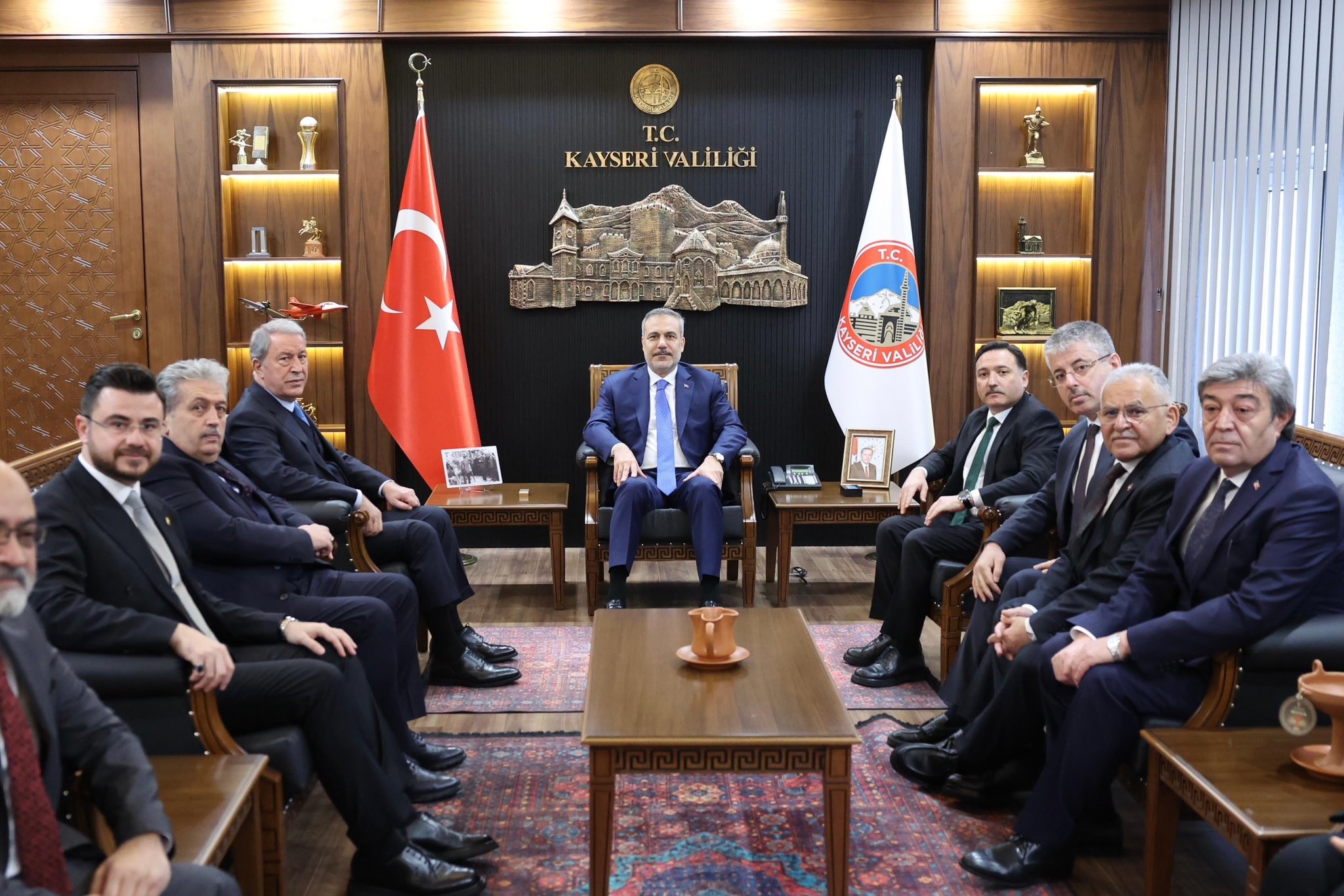 Kayseri Havaalanı'na iniş yapan Dışişleri Bakanı Hakan Fidan, ilk olarak Kayseri Valisi Gökmen Çiçek'i ziyaret etti. Kayseri Valiliği'nin şeref defterini imzalayan Bakan Fidan, burada bir süre Vali Çiçek ile görüştü. Ardından Kayseri Büyükşehir Belediye Başkanı Dr. Memduh Büyükkılıç’a nezaket ziyaretinde bulunan Fidan'a Büyükkılıç tarafından belediyenin çalışmaları hakkında bilgiler verildi.