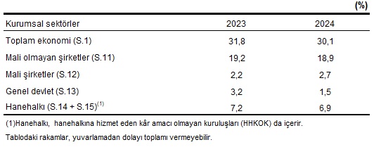 Toplam gayrisafi tasarrufun Gayrisafi Yurt İçi Hasıla’ya (GSYH) oranı 2024 yılında yüzde 30,1 oldu Toplam gayrisafi tasarrufun GSYH’ye oranı 2024 yılında toplam ekonomi için yüzde 30,1 oldu. Bu oran mali olmayan şirketler için yüzde 18,9 hanehalkı için yüzde 6,9 mali şirketler için yüzde 2,7 ve genel devlet için yüzde 1,5 oldu. Kurumsal sektörlere göre GSYH içindeki gayrisafi tasarruf oranları, 2023, 2024