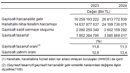 Gayrisafi hanehalkı tasarruf oranı 2024 yılı için yüzde 11,3 olduHanehalkı tasarrufunun harcanabilir gelire oranı olarak tanımlanan tasarruf oranı, 2023 yılında yüzde 11,8 iken 2024 yılında yüzde 11,3 oldu.Hanehalkı(1)sektörü temel göstergeler, 2023, 2024