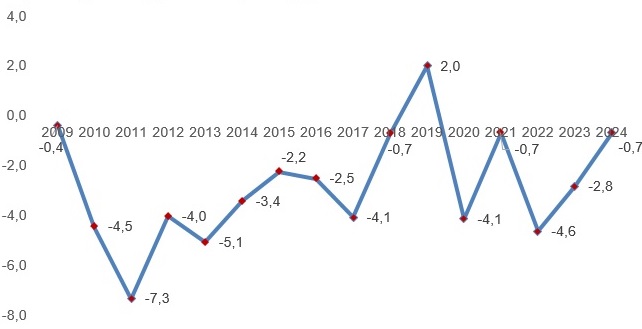 Net borç verme/net borç alma işleminin GSYH’ye oranı toplam ekonomi için 2024 yılında yüzde -0,7 olduToplam ekonomi 2023 yılında GSYH’nin yüzde 2,8 ile net borç alan pozisyondayken, 2024 yılında yüzde 0,7 ile net borç alan pozisyonda oldu.B9 (Net borç verme (+) / Net borç alma (-)) 2009-2024