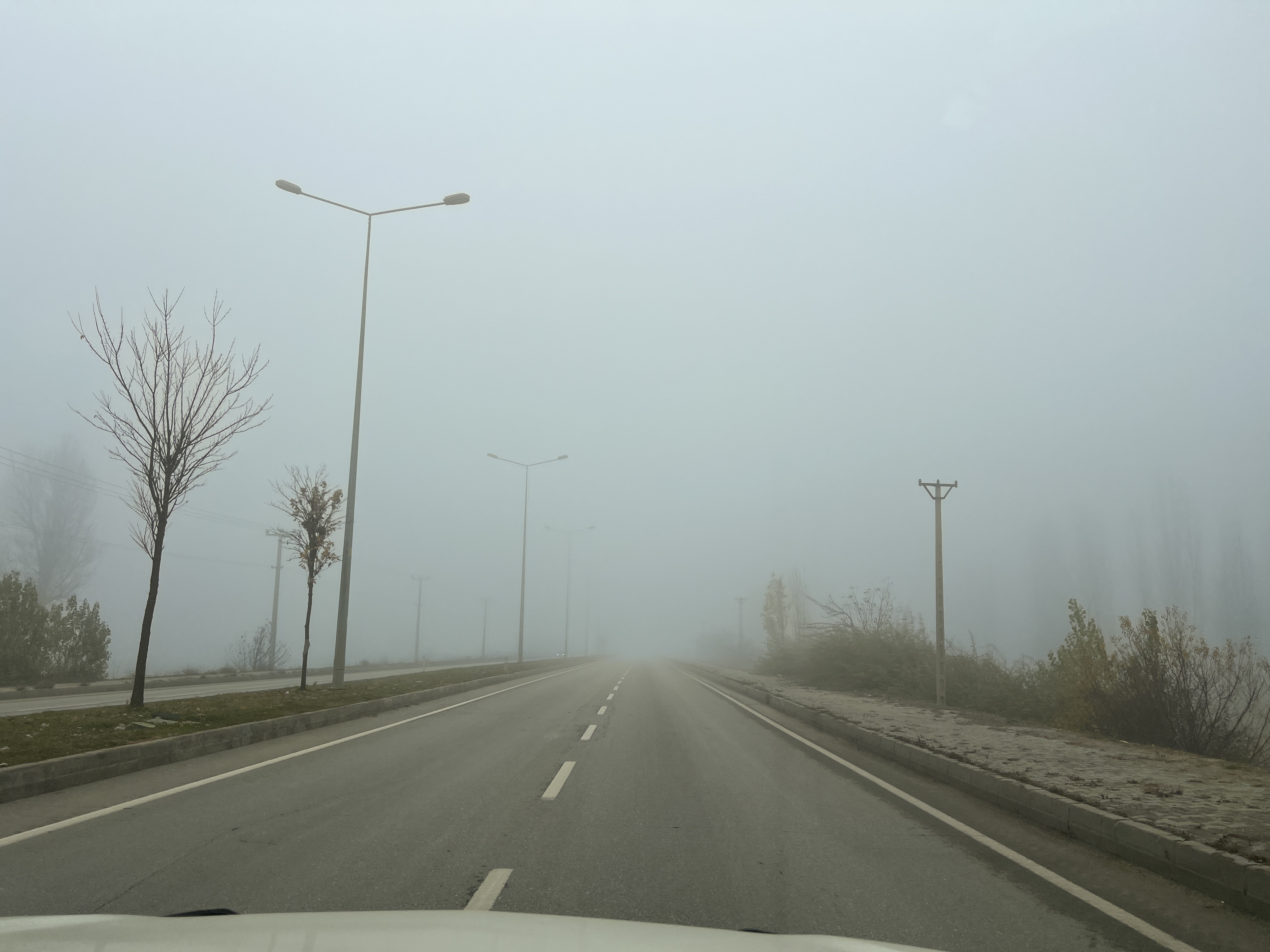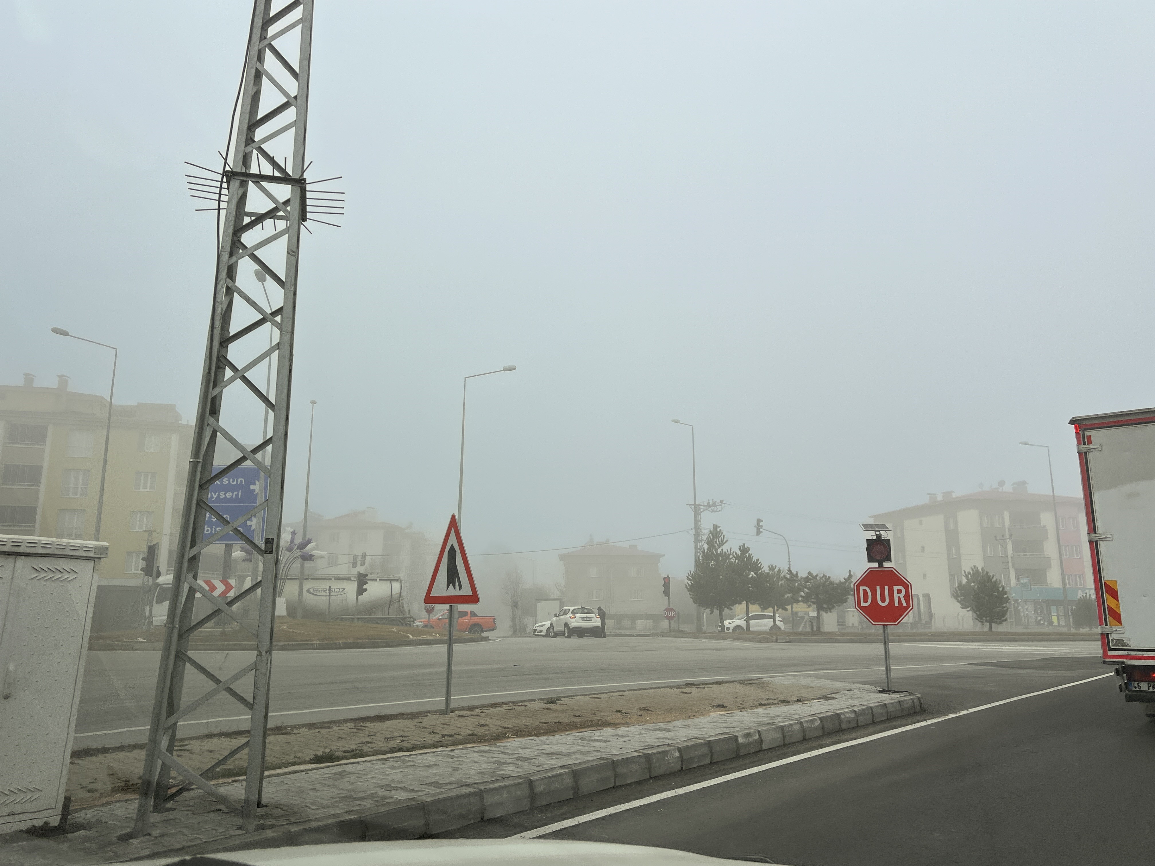 Yoğun sis nedeniyle bazı bölgelerde binalar ve ağaçlar neredeyse görünmez hale geldi.