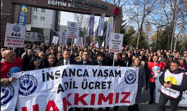 Ankara’da Gelir İdaresi Başkanlığı önünde toplanan sendika üyeleri adına açıklama yapan Kariyer Büro Sendikası Genel Başkanı Tolga Akgül şunları söyledi: