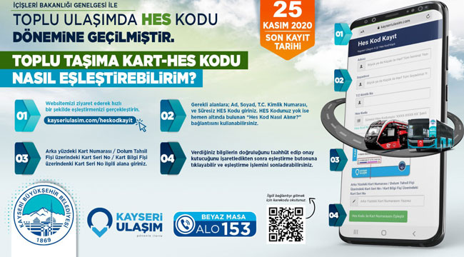 Evden çıkmadan rahatlıkla internetten HES kodu eşleştirmesinin yapılabileceğini ifade eden Başkan Dr. Memduh Büyükkılıç, “Bu işlemi evinizden çıkmadan https://kayseriulasim.com/heskodkayit internet sayfasına tıklayarak rahatlıkla gerçekleştirebilirsiniz. Herhangi bir mağduriyet yaşanmaması için sitede yer alan Ad, Soyad, T.C. Kimlik Numarası, Süresiz HES Kodu ve Toplu Taşıma Kart Numarası bilgilerini sisteme kaydederek Toplu Taşıma Kart-HES Kodu eşleştirmenizi yapmanız önemle rica olunur. Ayrıca KAYMEK’imizin, Spor A.Ş.’mizin bütün ekiplerini takviye etmek suretiyle Kart 38 ekiplerimiz, ulaşım birimlerimiz HES kodunu kartlarla eşleştirme konusunda gerekli desteği göstermekte ve çalışmaları yapmakta. Ayrıca Alo 153 üzerinden yine zabıtamız vasıtası ile bu hizmetin verildiğini de paylaşmak isterim. Vatandaşlarımızın bir ‘alo’ demesi yeterli” şeklinde konuştu.
