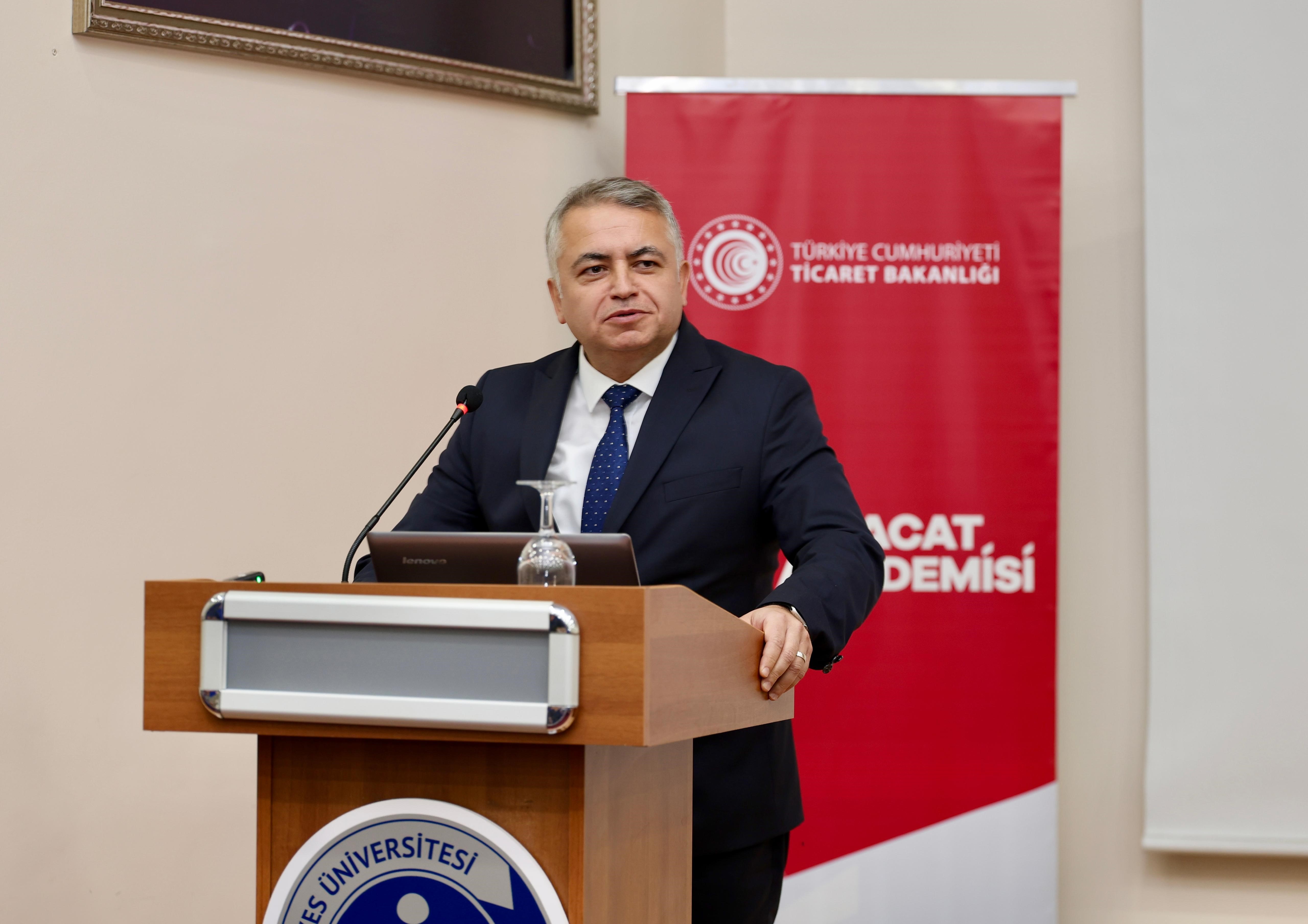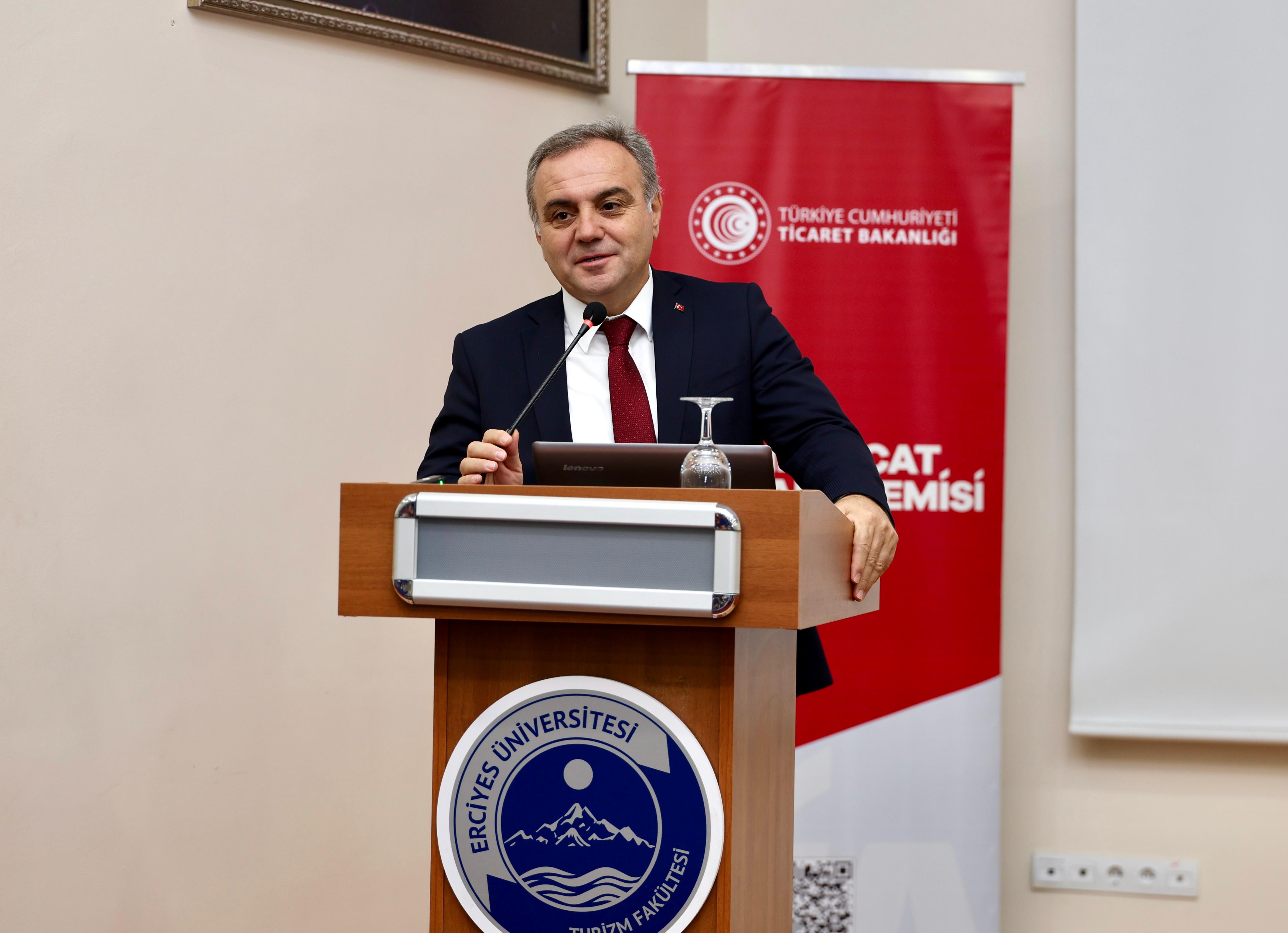 Ticaret Bakanlığı ile Erciyes Üniversitesi (ERÜ) arasında imzalanan iş birliği protokolü ile ihracatçılara yönelik yürütülen eğitim ve bilgilendirme faaliyetlerinin akademik ve kurumsal bir çatı altında güçlendirilmesi amacıyla hayata geçirilen İhracat Akademisi’nin eğitim programının ilk dersi, İhracat Genel Müdürü Mehmet Ali Kılıçkaya tarafından verildi.