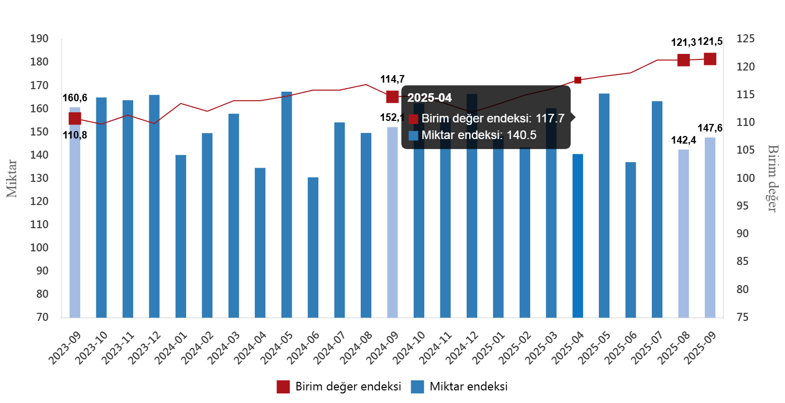 İthalat birim değer endeksi yüzde 1,7 arttıİthalat birim değer endeksi Eylül ayında bir önceki yılın aynı ayına göre yüzde 1,7 arttı. Endeks bir önceki yılın aynı ayına göre, gıda, içecek ve tütünde yüzde 10,2 arttı, yakıtlarda yüzde 9,1 azaldı, ham maddelerde (yakıt hariç) yüzde 4,5 azaldı, imalat sanayinde (gıda, içecek, tütün hariç) yüzde 2,0 arttı.İthalat miktar endeksi yüzde 6,9 arttıİthalat miktar endeksi Eylül ayında bir önceki yılın aynı ayına göre yüzde 6,9 arttı. Endeks bir önceki yılın aynı ayına göre, gıda, içecek ve tütünde yüzde 10,9 arttı, ham maddelerde (yakıt hariç) yüzde 3,2 arttı, yakıtlarda yüzde 6,1 arttı, imalat sanayinde (gıda, içecek, tütün hariç) yüzde 3,5 arttı.İthalat birim değer ve miktar endeksleri, Eylül 2025[2015=100]
