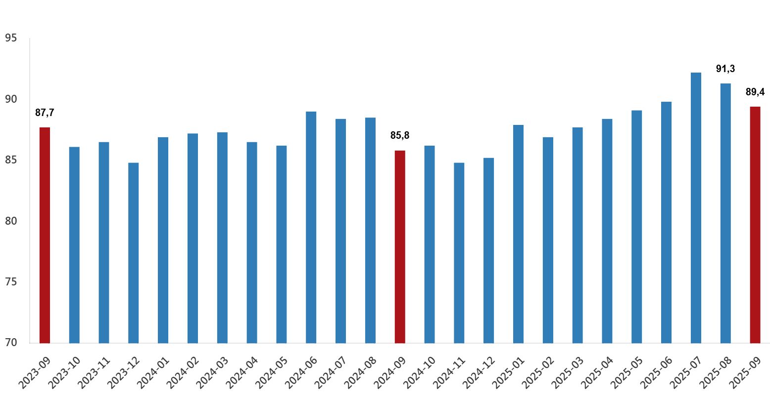 Dış ticaret haddi 2025 yılı Eylül ayında 89,4 olarak gerçekleştiİhracat birim değer endeksinin ithalat birim değer endeksine bölünmesiyle hesaplanan ve 2024 yılı Eylül ayında 85,8 olarak elde edilmiş olan dış ticaret haddi, 3,6 puan artarak, 2025 yılı Eylül ayında 89,4 oldu.Dış ticaret hadleri, Eylül 2025