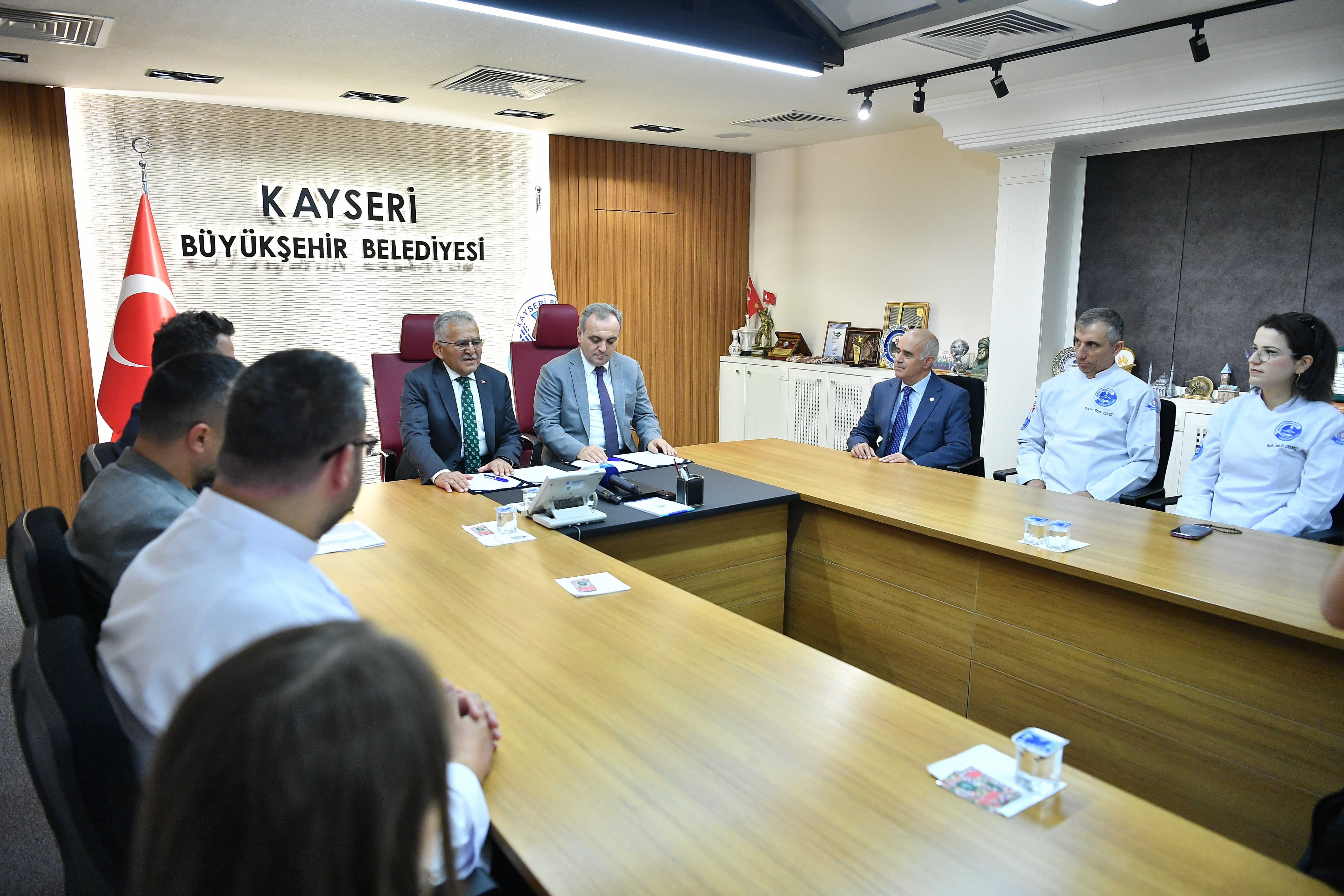 Eğitime, gençlere ve Kayseri’nin marka değerine verdikleri önemi her fırsatta dile getiren Başkan Büyükkılıç, protokol ile Erciyes Üniversitesi Turizm Fakültesi öğrencilerine staj, işbaşı eğitimi ve yarı zamanlı çalışma gibi birçok uygulamalı fırsatı sunacak. Bu kapsamda, Erciyes Üniversitesi Rektörü Prof. Dr. Fatih Altun, Büyükşehir Belediye Başkanı Dr. Memduh Büyükkılıç’ı makamında ziyaret etti. Başkanlık Toplantı Salonu’nda gerçekleşen ziyarette, Gastronomi Alanında Nitelikli İnsan Kaynağı ve Uygulamalı Eğitim İş Birliği Protokolü’ne imzalar atıldı. Ziyarette, Turizm Fakültesi Dekanı Prof. Dr. Kenan Güllü, Gastronomi ve Mutfak Sanatları Bölüm Başkanı Doç. Dr. Erşan Yıldız ve Gastronomi ve Mutfak Sanatları Bölümü öğrencileri ile akademisyenler de hazır bulundu.