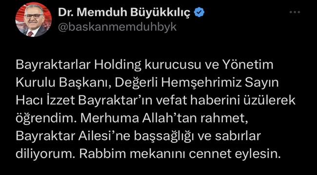 Vefat haberini alan Kayseri Büyükşehir Belediye Başkanı Memduh Büyükkılıç sosyal medya hesabından “Bayraktarlar Holding kurucusu ve Yönetim Kurulu Başkanı, Değerli Hemşehrimiz Sayın Hacı İzzet Bayraktar’ın vefat haberini üzülerek öğrendim. Merhuma Allah’tan rahmet, Bayraktar Ailesi’ne başsağlığı ve sabırlar diliyorum. Rabbim mekanını cennet eylesin” paylaşımında bulundu.