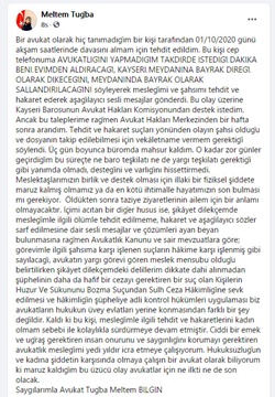 Kayseri Barosu avukatı Tuğba Meltem Bilgin, tanımadığı bir kişi tarafından cep telefonuna gelen sesli mesajla tehdit edildiğini söyledi. Avukat Bilgin, sosyal paylaşım sayfasından yaptığı paylaşımda, "Bir avukat olarak hiç tanımadığım bir kişi tarafından 1 Ekim günü akşam saatlerinde davasını almam için tehdit edildim. Bu kişi cep telefonuma avukatlığını yapmadığım takdirde istediği dakika beni evimden aldıracağını, kayseri meydanına bayrak direği olarak dikeceğini, meydanında bayrak olarak sallandırılacağını söyleyerek mesleğimi ve şahsımı tehdit ve hakaret ederek aşağılayıcı sesli mesajlar gönderdi" diye konuştu.