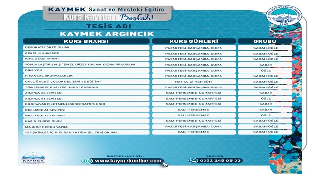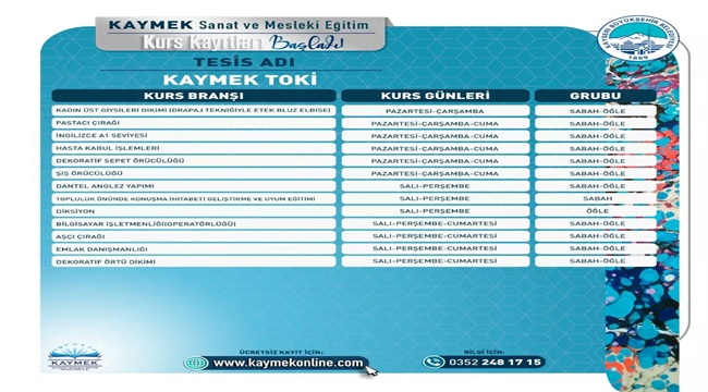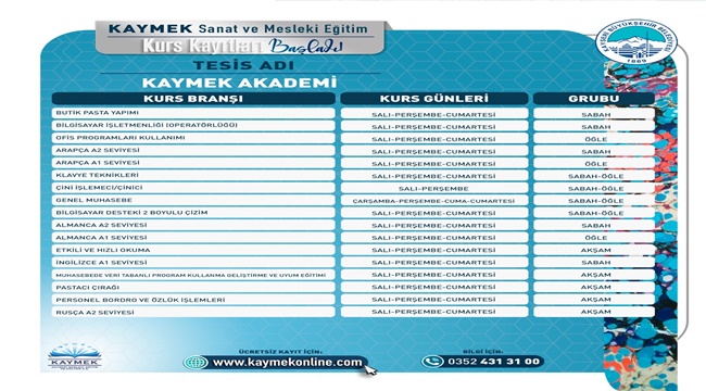 Kayıt yaptırmak isteyen vatandaşlar KAYMEK web sitesi (www.kaymekonline.com) üzerinden işlem sağlayabilecek. Ayrıca 0 352 231 80 31 telefon numarasından kurslarla ilgili detaylı bilgi alınabilecek
