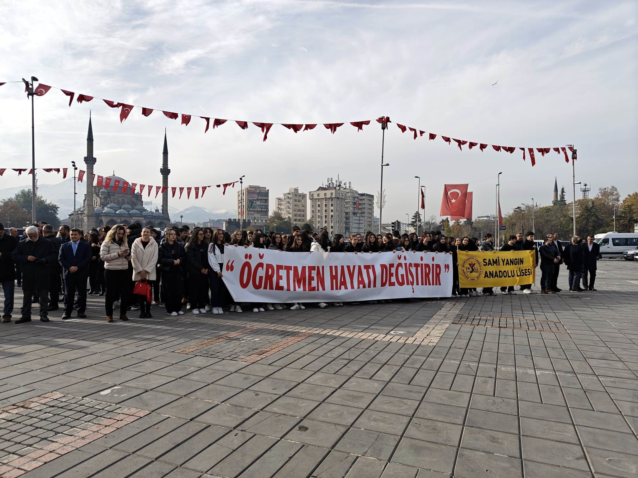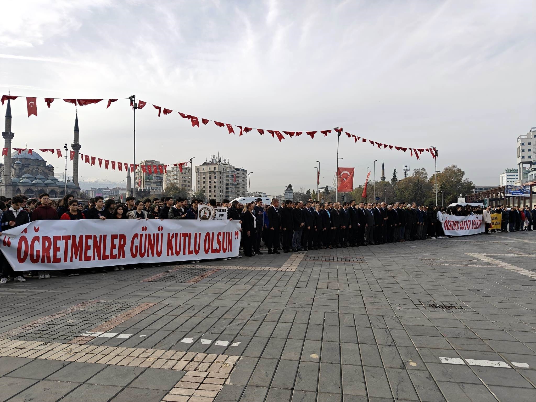Cumhuriyet Meydanı’nda düzenlenen törene Kayseri İl Milli Eğitim Müdürü Coşkun Esen, Kayseri İl Kültür ve Turizm Müdürü Şükrü Dursun, ilçe milli eğitim müdürleri, öğretmenler ve öğrenciler katıldı. Törende açıklama yapan İl Milli Eğitim Müdürü Coşkun Esen, "Bugün 24 Kasım Öğretmenler Günü. Tüm yurtta olduğu gibi ilimizde de büyük bir coşkuyla, çeşitli programlarla kutlamaya devam edeceğiz. Öğretmenlik aslında sadece bir mesleğin adı değil aynı zamanda bir idealin, bir adanmışlık ruhunun temsilidir. Dolayısıyla her bir öğretmenimizin, ilimiz başta olmak üzere ülkemizde görev yapan tüm öğretmenlerimizin en önemli vasfı adanmış olmalarıdır. Bir ideal uğruna adandıkları yolda hiç bıkmadan, usanmadan yürümeleridir. Biz de ilimizde yaklaşık 23 bin öğretmenimizle birlikte çocuğumuzu daha iyi yetiştirmek, çocuğa bu ideali vermek, erdemli ve liyakatli bir insan olarak yetiştirmek için var gücümüzle çalışıyoruz. İdealimiz budur" dedi.