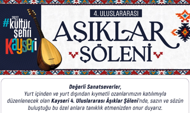 Türk halk edebiyatının köklü geleneği olan âşıklık kültürü, Kayseri’de bir kez daha sanatseverlerle buluşuyor. Kayseri Valiliği, Kayseri Büyükşehir Belediyesi, Kayseri İl Kültür ve Turizm Müdürlüğü ile Kayseri Halk Ozanları Kültür Derneği iş birliğiyle düzenlenen 4. Uluslararası Âşıklar Şöleni, 31 Ocak 2026 Cumartesi günü saat 19.00’da Erciyes Kültür Merkezi Turkuaz Salon’da gerçekleştirilecek.
