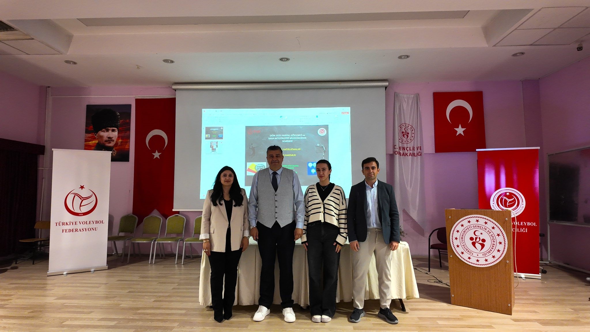 2025-2026 voleybol sezonu kapsamında hakem, gözlemci ve saha görevlilerinin mesleki bilgi ve becerilerinin geliştirilmesi amacıyla Ekim Ayı Hakem, Gözlemci ve Saha Müdürlüğü Bilgilendirme Semineri, Kayseri Gevher Nesibe Spor Salonu Toplantı Salonu'nda gerçekleştirildi. Seminer; sezonun ilk ayının değerlendirilmesi, uygulamada karşılaşılan durumların analiz edilmesi ve hakemlerin görevlerine ilişkin teknik bilgilerin güncellenmesi amacıyla yapıldı. Seminerin ilk bölümünde, Uluslararası Voleybol Hakemi ve İl Temsilcisi İsmail Yıldırım, Kayseri Voleybol İl Hakem Kurulu Üyesi ve Gözlemci Cihan Demir, Kayseri Voleybol İl Hakem Kurulu Üyesi ve Ulusal Hakem Betül Söğüt, Kayseri Voleybol İl Hakem Kurulu Üyesi ve Ulusal Hakem Ömer Açıcı, tarafından sezonun başlangıcından itibaren oynanan karşılaşmaların genel değerlendirmesi yapıldı. Bu bölümde hakem performansları, maç yönetimi süreçleri ve saha uygulamalarına yönelik gözlemler paylaşıldı; tespit edilen olumlu ve geliştirilmesi gereken yönler hakkında bilgi verildi. Seminerin ikinci bölümünde ise Ulusal Aday Hakem Kürşat Yörük, İl Hakem Hatice Albayrak ve Aday Hakem Nurgül Açıkgöz tarafından seminerin konusu olan '8. Bölüm: Hakemler / Başhakem' başlıklı sunum gerçekleştirildi.