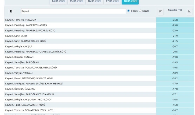 Meteoroloji’den alınan bilgilere göre Kayseri’nin en soğuk yeri - 26,8 derece ile Tomarza ilçesi oldu. Şehirdeki bazı bölgelerde ölçülen değerler şu şekilde;Pınarbaşı - 25, Pınarbaşı Pazarsu köyü - 23, Sarız - 21.9, Sarız Yedioluk köyü - 21.5, Akkışla - 20.7, Pınarbaşı Yukarıkızılçevrik köyü - 20.5, Bünyan - 19.8, Sarıoğlan - 19.5, Tomarza Arslantaş köyü - 19.5, Yahyalı - 18.9.
