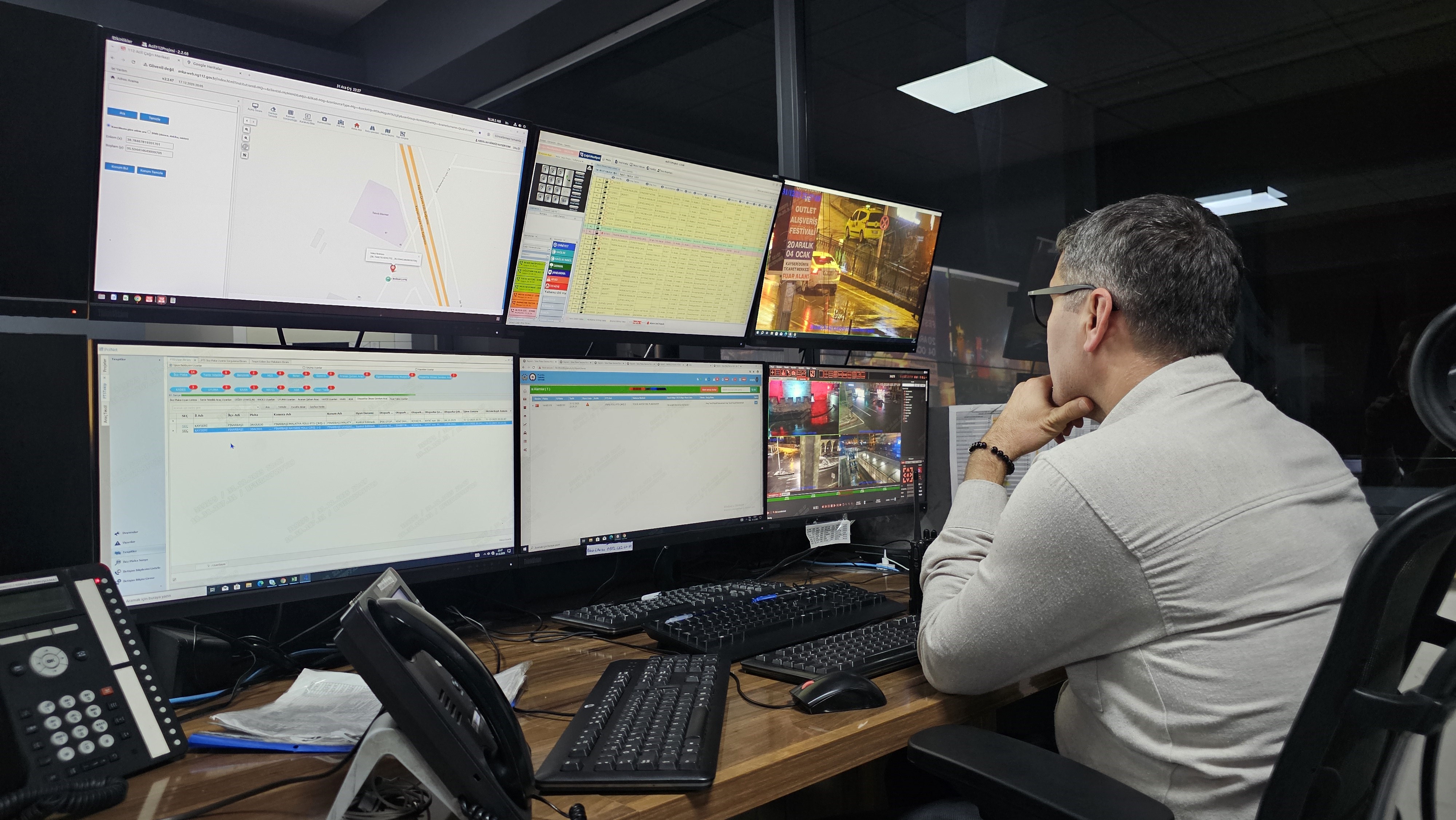 Bilgi Teknolojileri ve Haberleşme Şube Müdürvekili Başkomiser Emre Ağca, vatandaşların yeni yılını kutlayarak, "Kayseri İl Emniyet müdürlüğü olarak yılbaşının huzur ve güven ortamında geçmesi, vatandaşların rahat bir şekilde seyahat etmeleri için her türlü trafik ve asayiş tedbirleri alınmış durumdadır. Öncelikli görevlerimizden birisi 112 ihbar hattı üzerinden gelen ihbarları değerlendirerek ilgili ekiplerin sevkini hızlı bir şekilde sağlıyoruz. Zor durumda olan vatandaşların yardımına biran önce koşmak için çalışıyoruz. Bunun dışında sistem üzerinden takip ettiğimiz konular var. HAYDİ, KAAN, KADES konuları, KGYS ve PTS üzerinden takip ettiğimiz şüpheli şahıs ve araç üzerinde de ekiplerimizi sevk ederek kontrollerini sağlıyoruz" dedi.