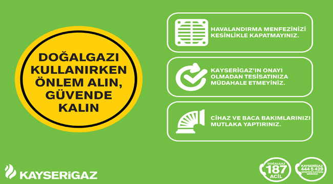 Kayserigaz Genel Müdürü Dinçer Akbaba, “Doğal gaz kullanımının arttığı sonbahar ve kış aylarında, abonelerimizi gerekli güvenlik önlemlerini bir an önce almaya davet ediyoruz. Bunun için güvenli kullanım tedbirlerinin yer aldığı mesajlarımızı hazırlayarak abonelerimizi mümkün olan tüm mecralardan bilgilendiriyoruz” dedi. Dinçer Akbaba, özellikle Kayserigaz’ın onayı olmadan müdahale edilen tesisatların oluşturduğu tehlikeye dikkat çekerek; “Abonelerimizin, doğal gazla çalışan cihazların projesinde değişiklik yapacak şekilde kendilerinin müdahalede bulunmamaları, cihaz taktırdıklarında veya mevcut doğal gaz tesisatlarında bir değişiklik yapmaları gerektiğinde mutlaka Kayserigaz’a başvurmaları gerekiyor. Abonelerimizin ve ailelerinin güvenliği için baca bakımının ve cihaz temizliğinin her yıl düzenli olarak yaptırılması oldukça önemli. Doğal gaz kullanırken cihazın bulunduğu alanda yer alan havalandırma menfezlerini mutlaka açık tutmak gibi hayati kuralların ihmal edilmemesi büyük önem taşıyor” dedi. Kayserigaz’dan yapılan açıklamada, doğal gazın güvenli kullanımı için dikkat edilmesi gereken 13 madde şu şekilde sıralandı: