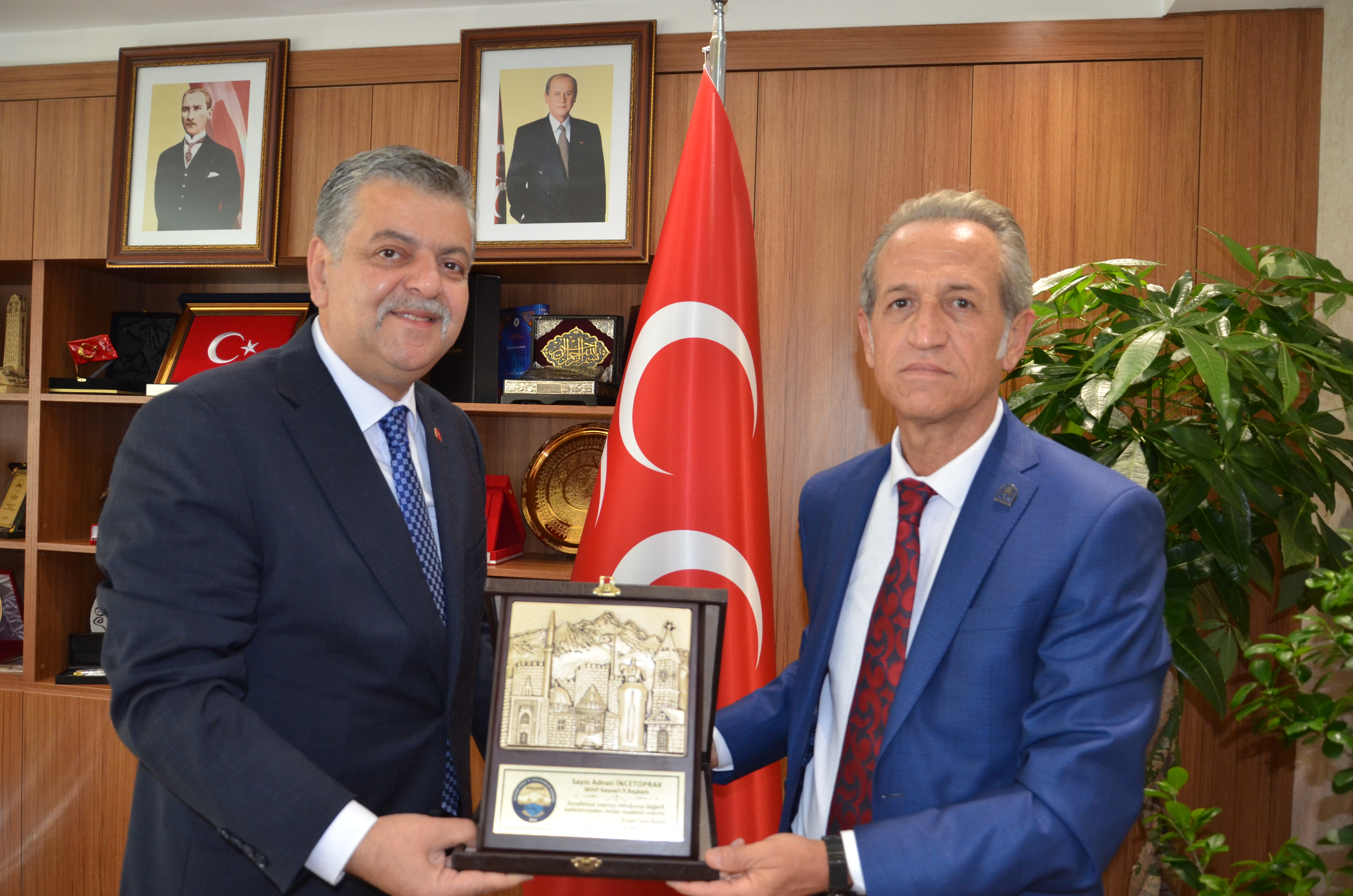 Ziyarette Kemal Erçalık tarafından, MHP İl Başkanı İncetoprak'a Ahilik Nasihati ile esnaf ve sanatkarlara vermiş olduğu desteklerden ötürü plaket verildi.