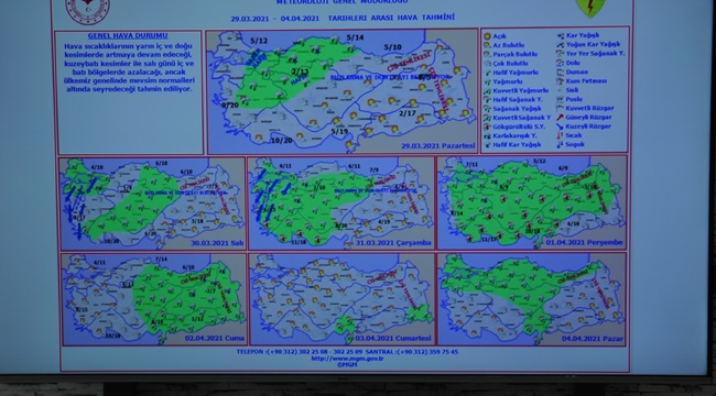 “Özellikle gündüz saatlerinde yağmur ve sağanak şeklinde oluşacak yağışların akşam saatlerinden sonra sıcaklığın azalmasına bağlı olarak karla karışık yağmur, yüksek kesimlerde ve geçitlerde ise yer yer kar yağışı şeklinde yağış olmasını bekliyoruz. Karayolları geçitler tahmin raporumuzda ve demir yolları hava raporumuzda özellikle durumu belirterek, yüksek kesimlerde karla karışık yağmurların, gece ve gündüz saatlerinde de zirai don, buzlanma gibi durumlarla beraber yer yer sis ve pus hadiselerinin görüleceğini önemle aktarıyoruz. Özellikle vatandaşlarımızı Perşembe günü beklenen sağanak ve gök gürültülü sağanak yağışlar hakkında uyarıyoruz. Perşembe günü kararsızlık durumunun artmasında dolayı yer yer dolu yağışları görülebilir. Bundan dolayı dikkatli ve tedbirli olunmasında fayda var. Özellikle bu gece zirai don olayının devam etmesini bekliyoruz. Gece minimum sıcaklıklarında azalacağı yerlerde zirai don olayının devam edeceğini ve hafta sonuna kadar zirai don konusunda dikkatli ve tedbirli olunmasında fazda olacağını söyleyebiliriz.”