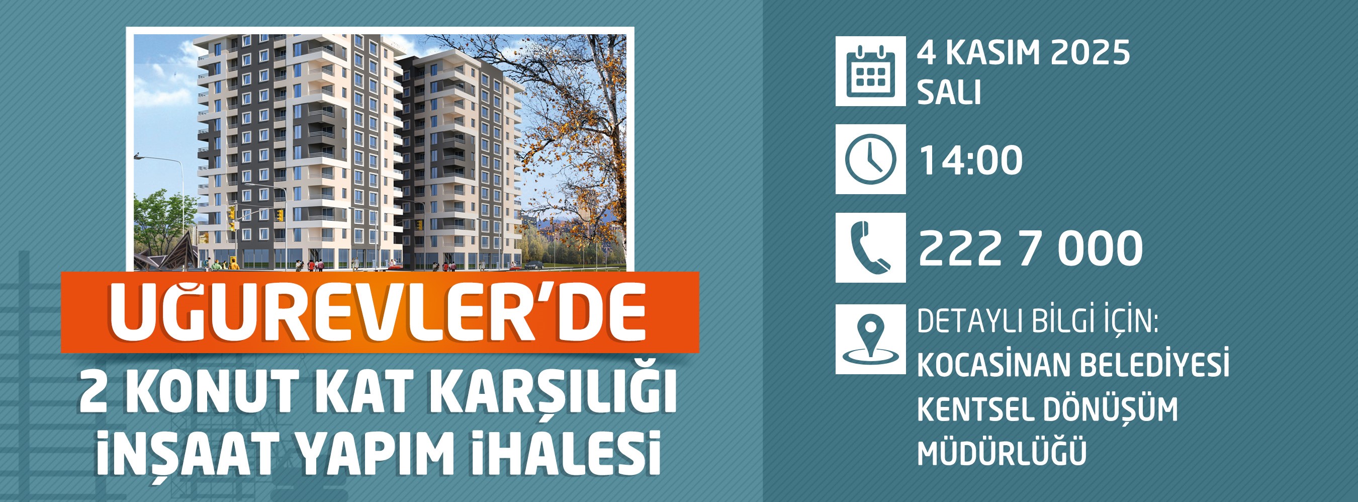 Öte yandan Kocasinan Belediyesi’nin kentsel dönüşüm projeleri kapsamında Uğurevler Mahallesi’nde 4 Kasım Salı günü saat 14.00’te kat karşılığı ihalesi gerçekleştirilecek. Kat karşılığı ihalenin şartname ve eklerinin Kentsel Dönüşüm Müdürlüğü’nden temin edilebileceği gibi, 0 (352) 222 70 00 numaralı telefondan da ayrıntılı bilgi alınabileceği kaydedildi.