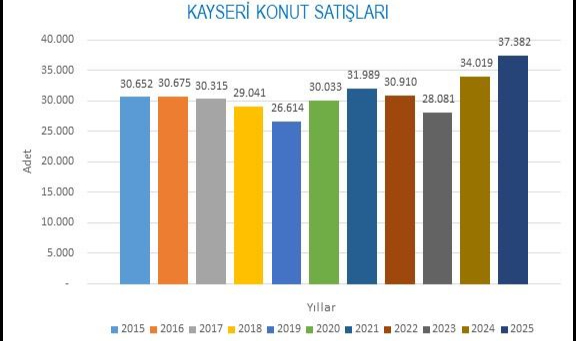Türkiye İstatistik Kurumu verilerine göre Konut Satışları Kayseri’de 2025 yılında 2024 yılına göre % 9,9 oranında artarak 37 bin 382 adet oldu. Bu rakamla 2025 yılı son on yılın en çok konutun satıldığı yıl oldu.